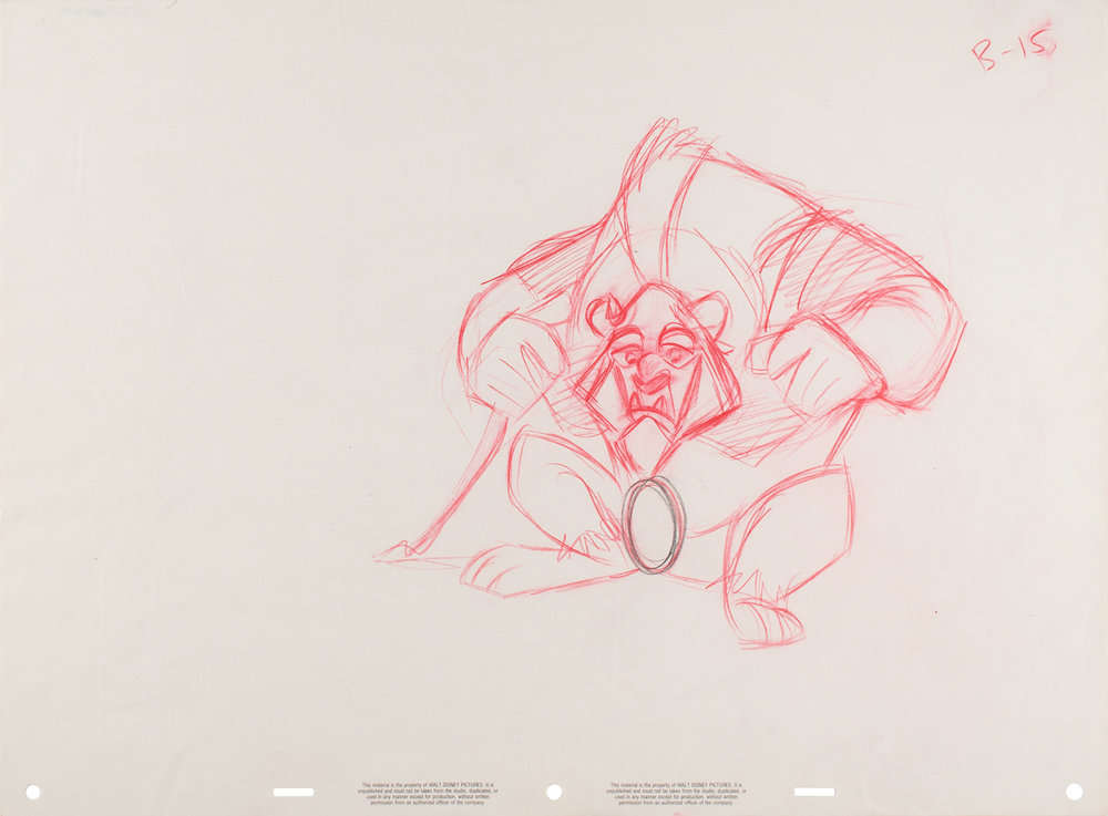 (Walt Disney Studios, 1991) Original rough production drawing of Beast from Beauty and the Beast, which shows the large warmhearted character in a crouching full-length pose measuring 9 x 8. Accomplished in graphite and colored pencil on untrimmed 17 x 12.5 animation paper marked "B-15" in the upper right corner. In fine condition, with a tiny tear to upper right corner and a few trivial wrinkles to left side.