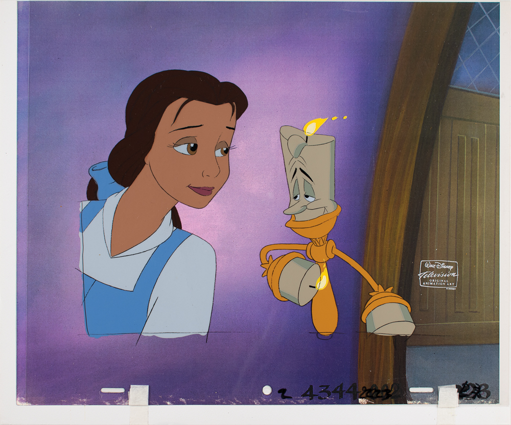 (Walt Disney Studios, 1998) Original production cels featuring Belle and Lumiere from the Beauty and the Beast: Belle's Magical World TV series. The cels are placed on a matching studio copy background. Images measure 4.5 x 6.75 (Belle) and 4 x 5.5 (Lumiere), with overall dimensions of 13.25 x 11. The piece has the silver Walt Disney Television Animation Art seal to lower right. In fine condition. Accompanied by a certificate of authenticity from The Walt Disney Company.