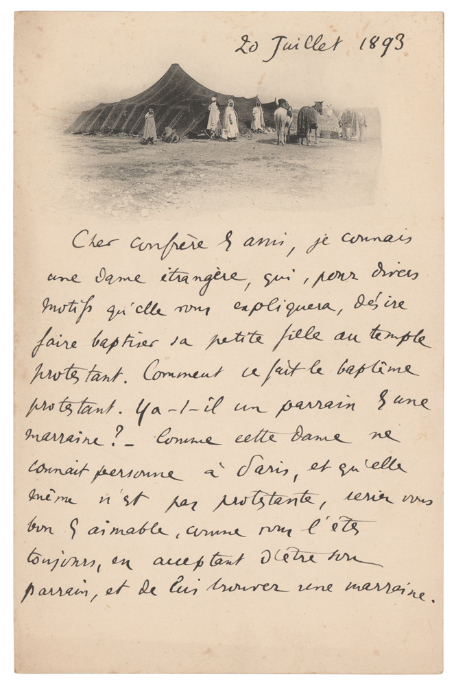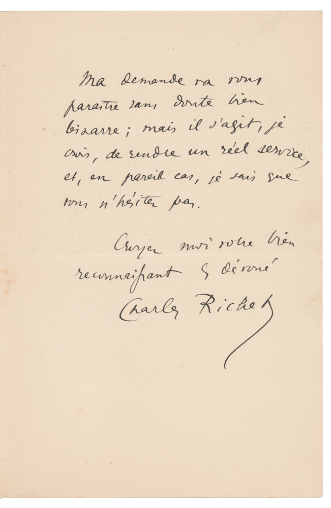 French physiologist (1850-1935) who won the 1913 Nobel Prize in Medicine for his work in anaphylaxis, which led to advances in the treatment of allergies. ALS in French, two pages on two adjoining sheets, 5 x 8, exotic illustrated letterhead, July 20, 1893. Letter concerning a potential Protestant baptism, in part (translated): "I know a foreign lady who, for various reasons that will suit you, wishes to have her little girl baptized in the Protestant temple. How does Protestant baptism work. Is there a godfather or a godmother?" In fine condition.