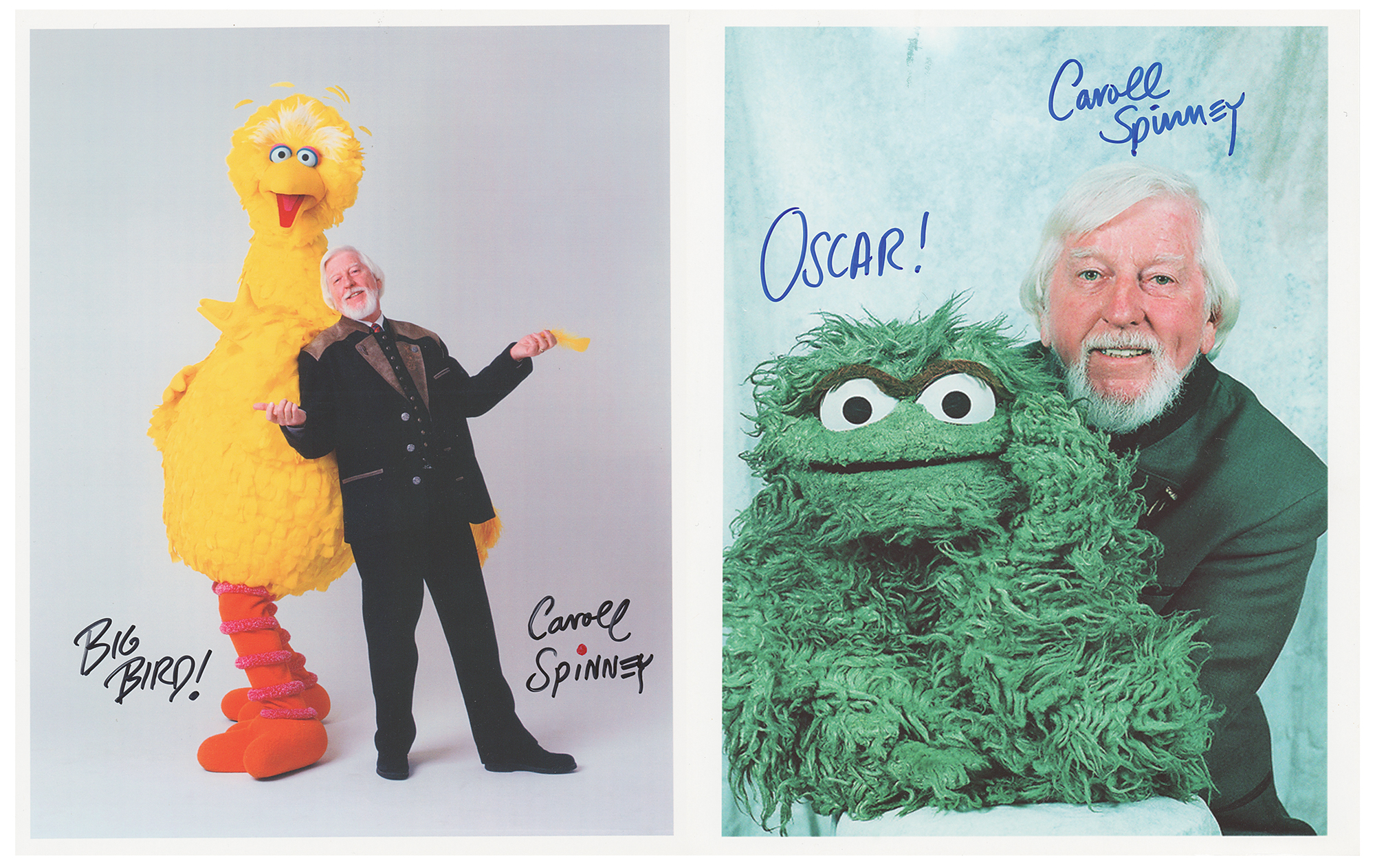 Two color semi-glossy 8 x 10 photo prints of Caroll Spinney posing with Big Bird and Oscar the Grouch, both signed in black or blue felt tip by Spinney, who adds the puppet names to each. In overall fine condition. Originally obtained by in-person specialist Mike Wehrmann.
