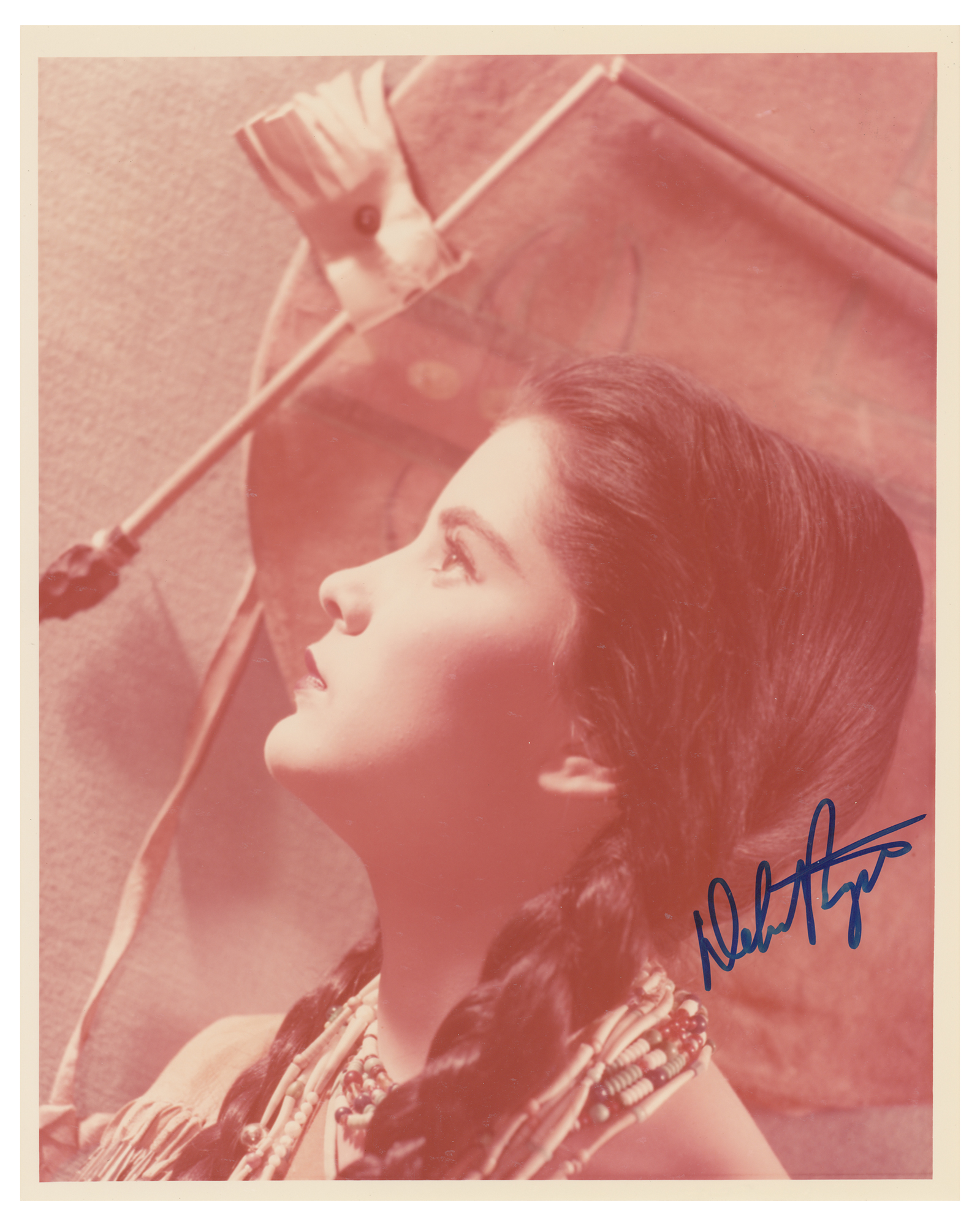 Color glossy 8 x 10 photo of Debra Paget as Sonseeahray in the 1950 Western film Broken Arrow, signed in blue felt tip. In fine condition, with scattered small surface scuffs and overall toning. Originally obtained by in-person specialist Mike Wehrmann.
