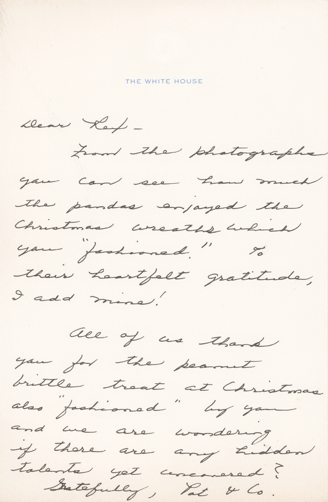 ALS as first lady, signed “Pat & Co.,” one page, 6.25 x 9.5, White House letterhead, no date. Letter to Rex Scouten, in part: "From the photographs you can see how much the pandas enjoyed the Christmas wreaths which you ‘fashioned.’ To their heartfelt gratitude, I add mine! All of us thank you for the peanut brittle treat at Christmas also ‘fashioned’ by you and we are wondering if there are any hidden talents yet uncovered?" In very fine condition.