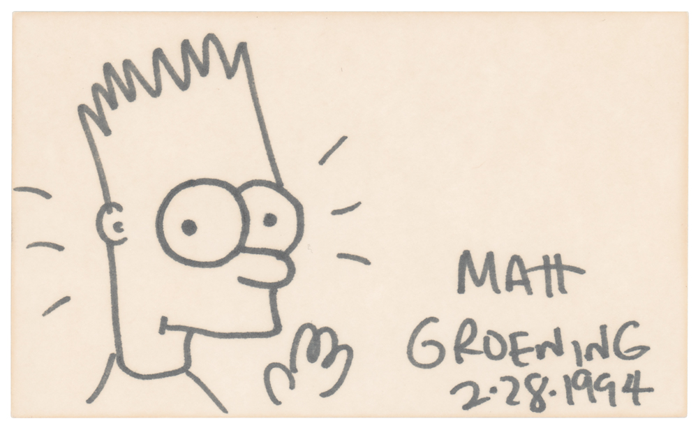 Desirable original felt tip sketch of Bart Simpson accomplished by Groening on an off-white 5 x 3 card, signed and dated in the lower right, "Matt Groening, 2-28-1994." In fine condition.