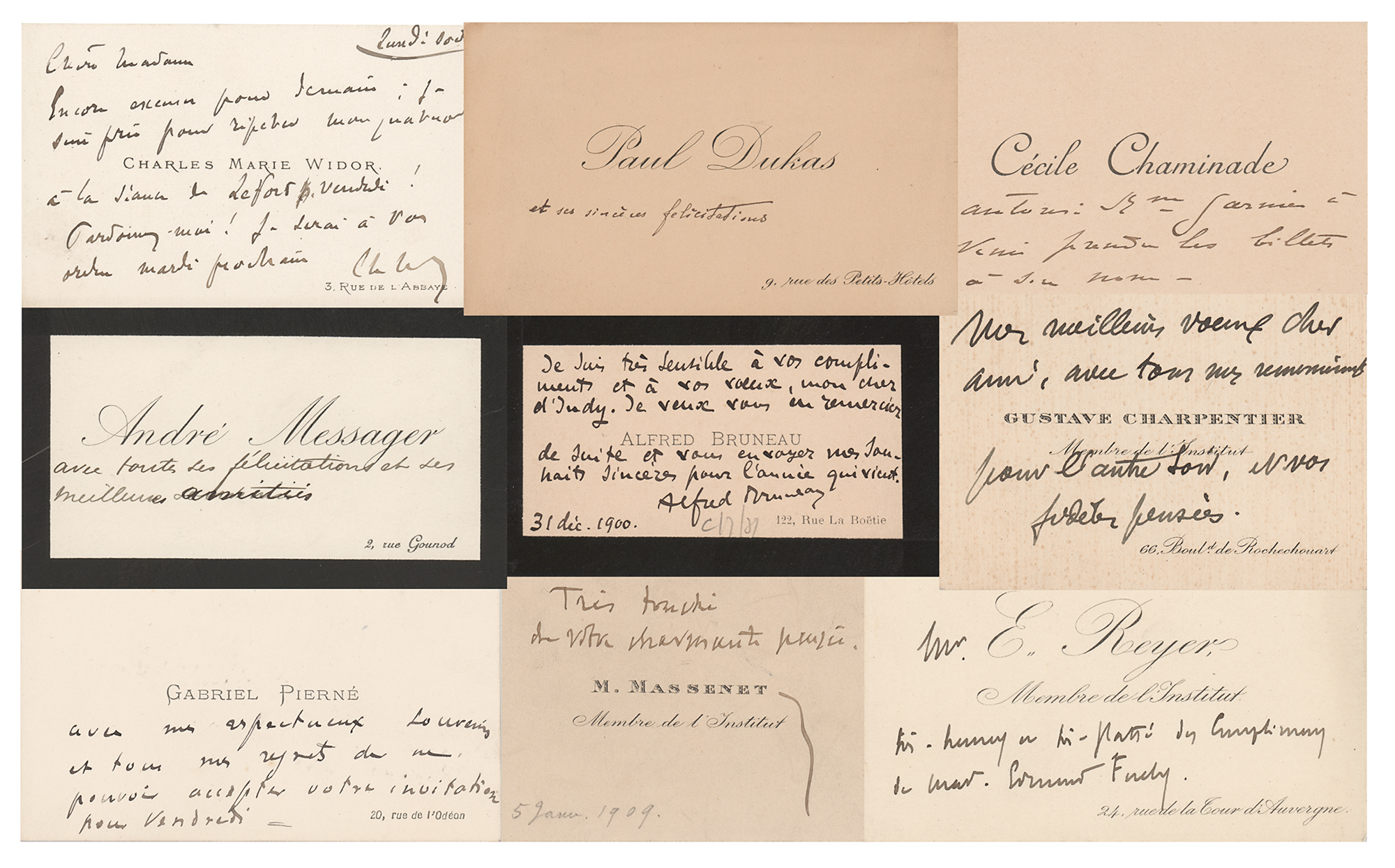 Group of nine personal calling cards of French composers, all annotated in their own hands, with a few signed. Includes: Jules Massenet, Cecile Chaminade, Charles Marie Widor (signed), Gabriel Pierne, Andre Messager, Paul Dukas, Alfred Bruneau (signed), Ernest Reyer, and Gustave Charpentier. In overall fine condition.