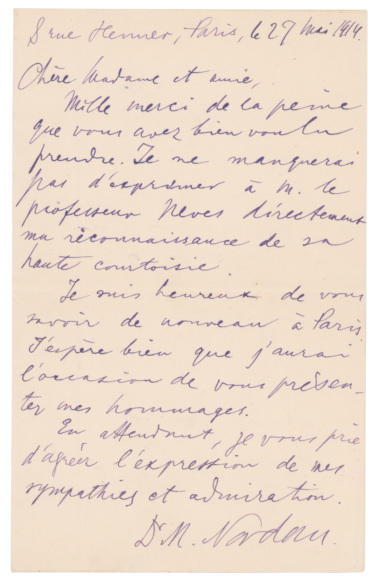 German physician, writer, and Jewish nationalist (1849-1923), who was instrumental in establishing recognition of Palestine as a potential Jewish homeland. Untranslated ALS in French, signed “Dr. M. Nordau,” one page, 4.25 x 7, May 27, 1914. In fine condition.