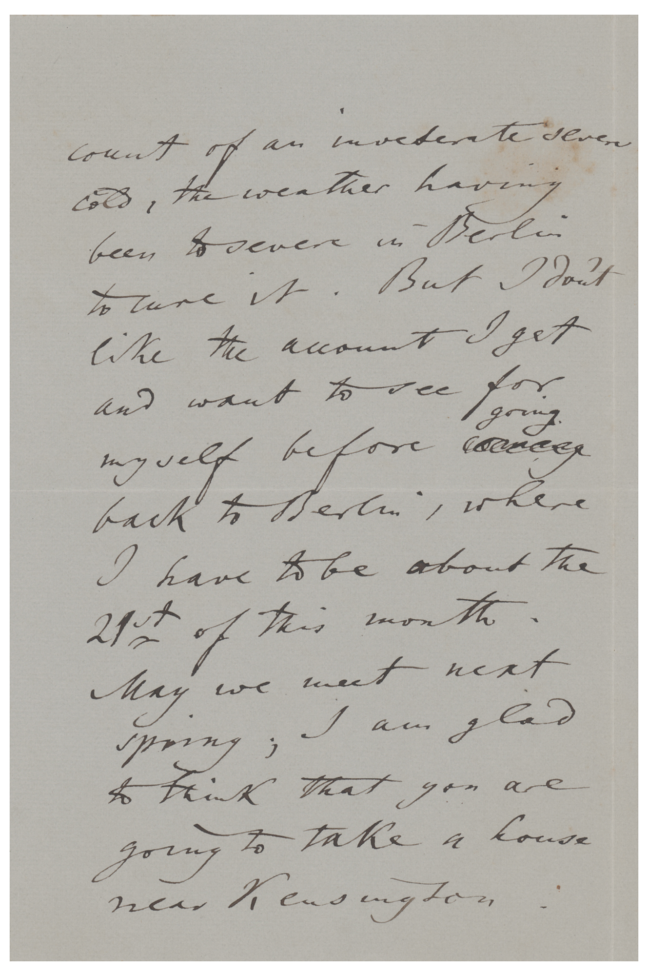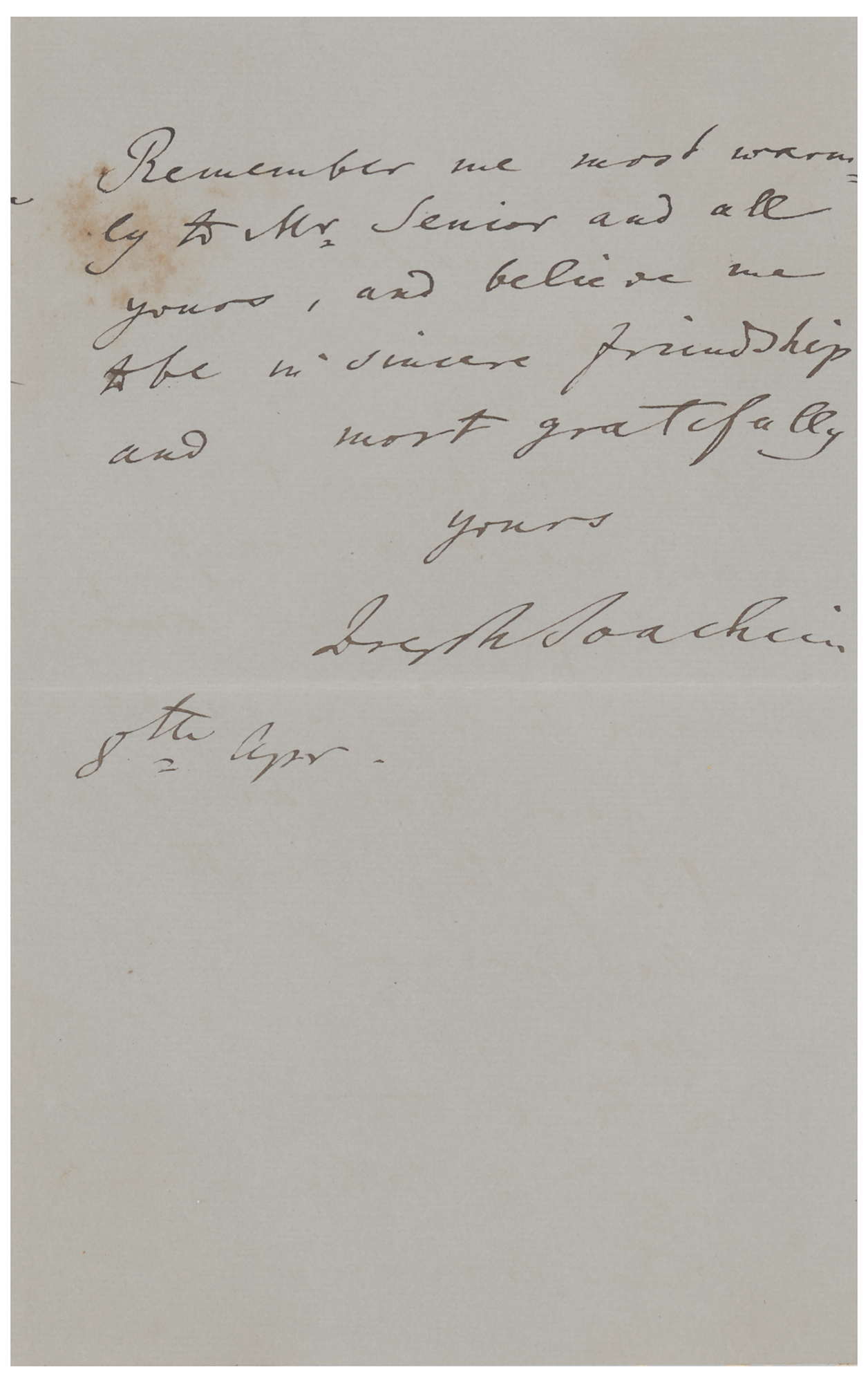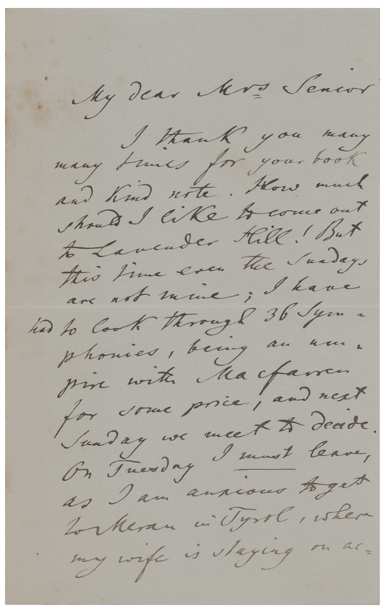 Hungarian violinist and composer (1831-1907) ranked second only to Paganini among 19th-century virtuosi. ALS, three pages on two adjoining sheets, 4.5 x 7, April 8. Letter to Mrs. Senior, in part: "How much should I like to come out to Lavender Hill! But this time even the Sundays are not mine; I have had to look through 36 Symphonies, being an umpire?I am anxious to get to Meran in Tyrol, where my wife is staying on account of an inveterate severe head cold." In very good to fine condition, with some small stains, and old mounting residue on the back of the last page.
