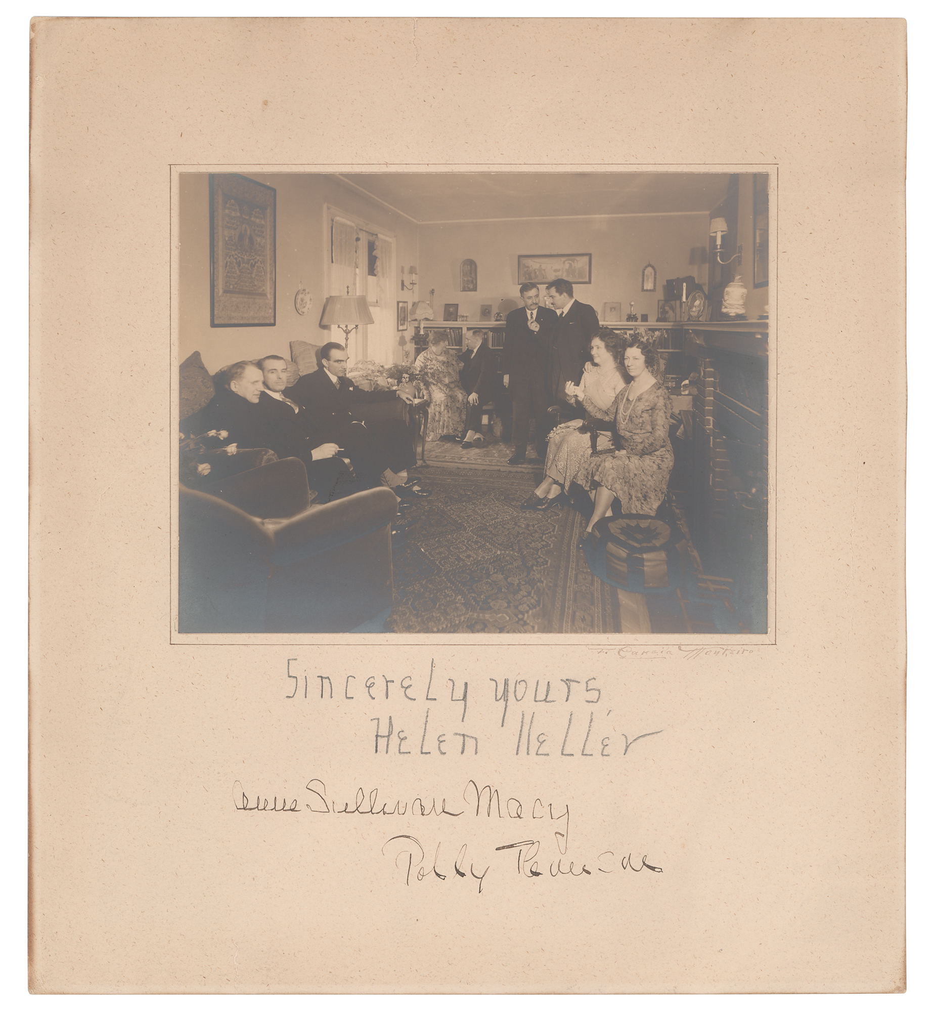 Rare vintage matte-finish 8.5 x 6.5 photo of Keller and her assistant, Polly Thomson, seated in their home in Forest Hills, New York, with other guests, affixed to its original 12.5 x 14 mount, prominently signed on the mount in pencil, "Sincerely yours, Helen Keller," and in ink, "Anne Sullivan Macy" and "Polly Thomson." Also signed below the image by the photographer, "F. Garcia Monteiro." In very good to fine condition, with creasing to the upper left corner, a short tear to middle of the top edge, a couple of tape repairs on the mount's reverse, and the photo attached only by its bottom edge. Items signed by Keller, her companion Thomson, and her teacher Sullivan are very scarce.