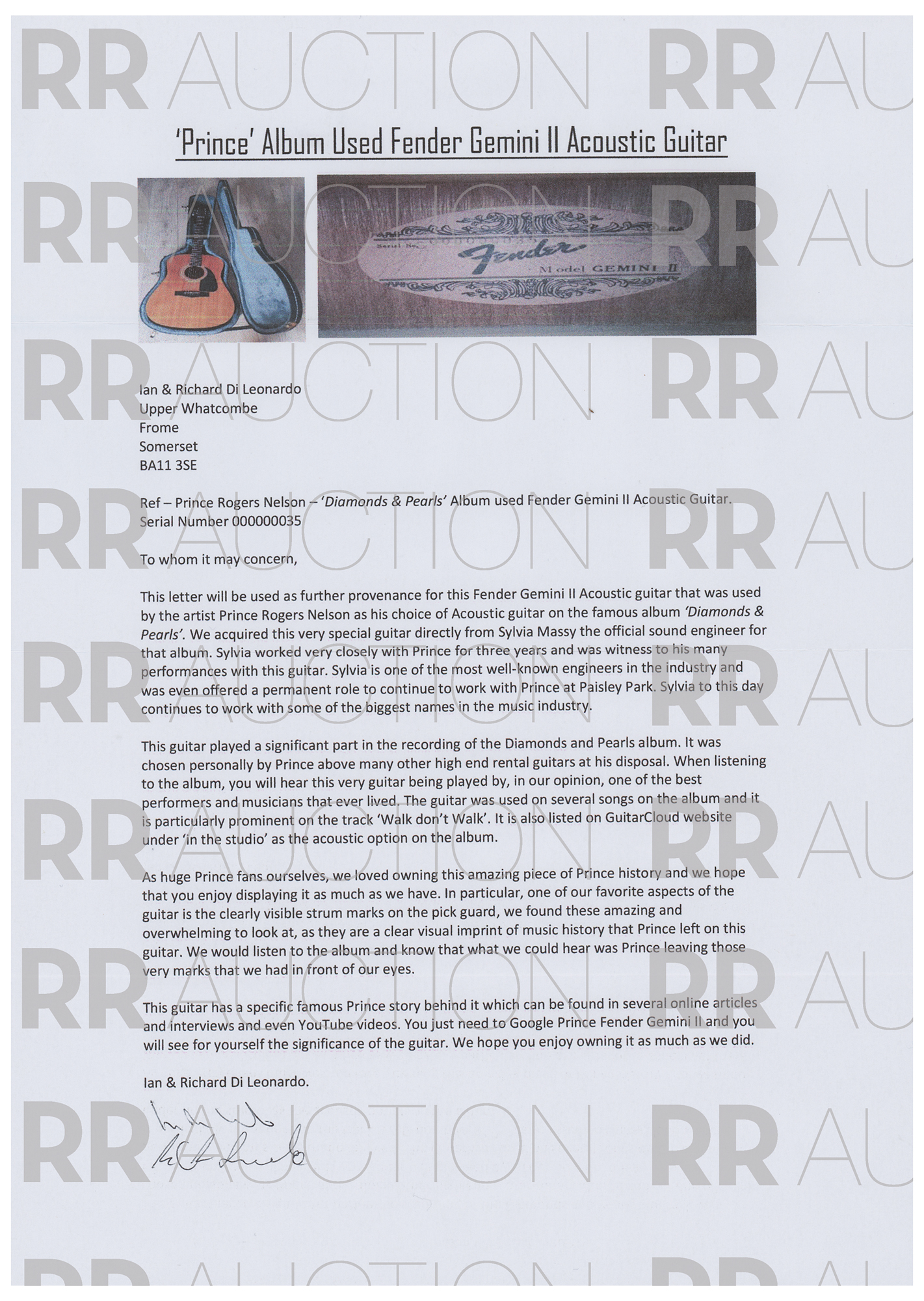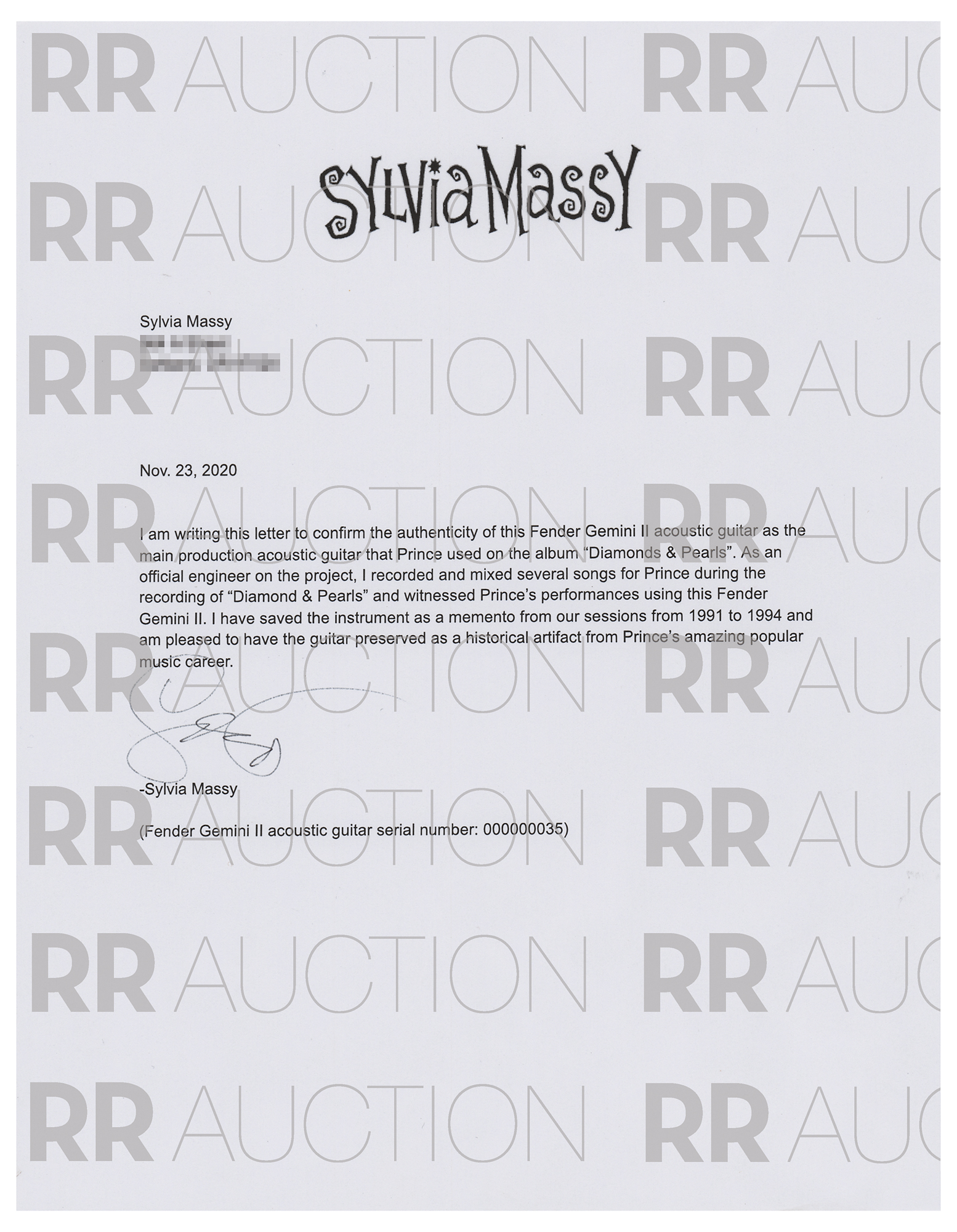 Accompanied by a signed letter of authenticity from acclaimed record producer, mixer, and engineer Sylvia Massy, who was one of several engineers who worked with Prince on Diamonds and Pearls. It reads: “I am writing this letter to confirm the authenticity of this Fender Gemini II acoustic guitar as the main production acoustic that Prince used on the album 'Diamonds and Pearls.’ As an official engineer on the project, I recorded and mixed several songs during the recording of 'Diamonds and Pearls' and witnessed Prince's performances using this Fender Gemini II. I have saved the instrument as a memento from our sessions from 1991 to 1994 and am pleased to have the guitar preserved as a historical artifact from Prince's amazing popular musical career.’