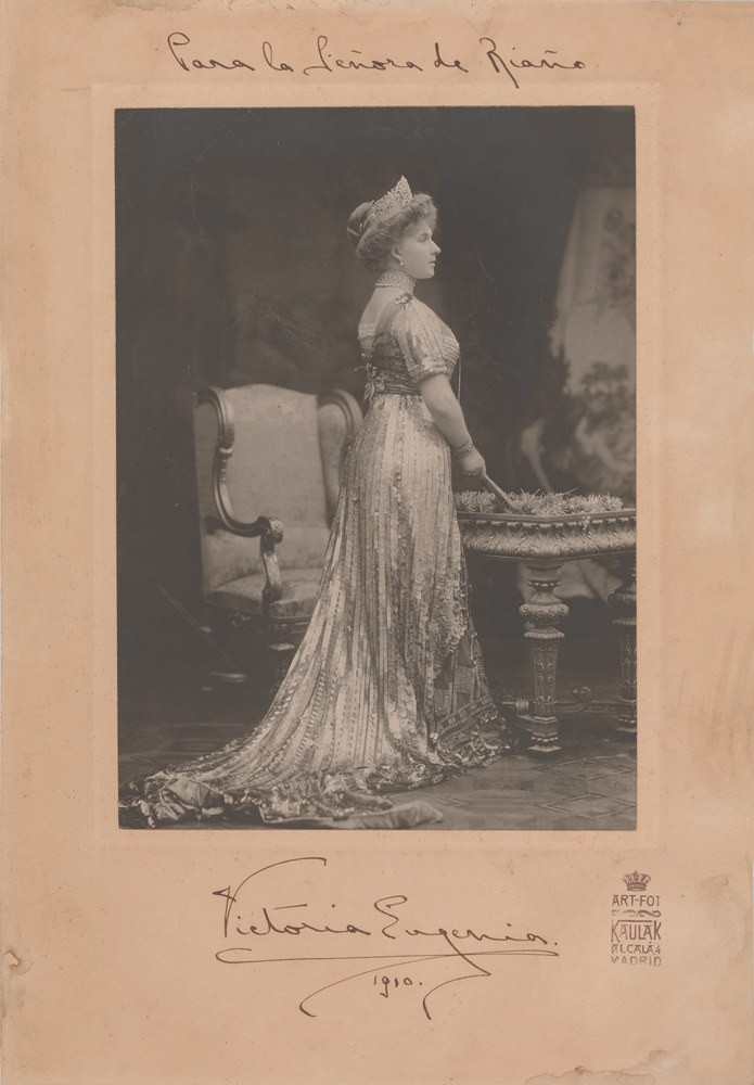 Queen consort of King Alfonso XIII of Spain (1887-1969). Vintage matte-finish 6 x 8.5 full-length photo of the queen in her crown jewels by Kaulak of Madrid, affixed to its original 9 x 13 mount, signed and inscribed on the mount in fountain ink, "Para la Senora de Riano, Victoria Eugenia, 1910.” In very good to fine condition, with lightly trimmed edges, light silvering to the image, and scattered staining to the mount.