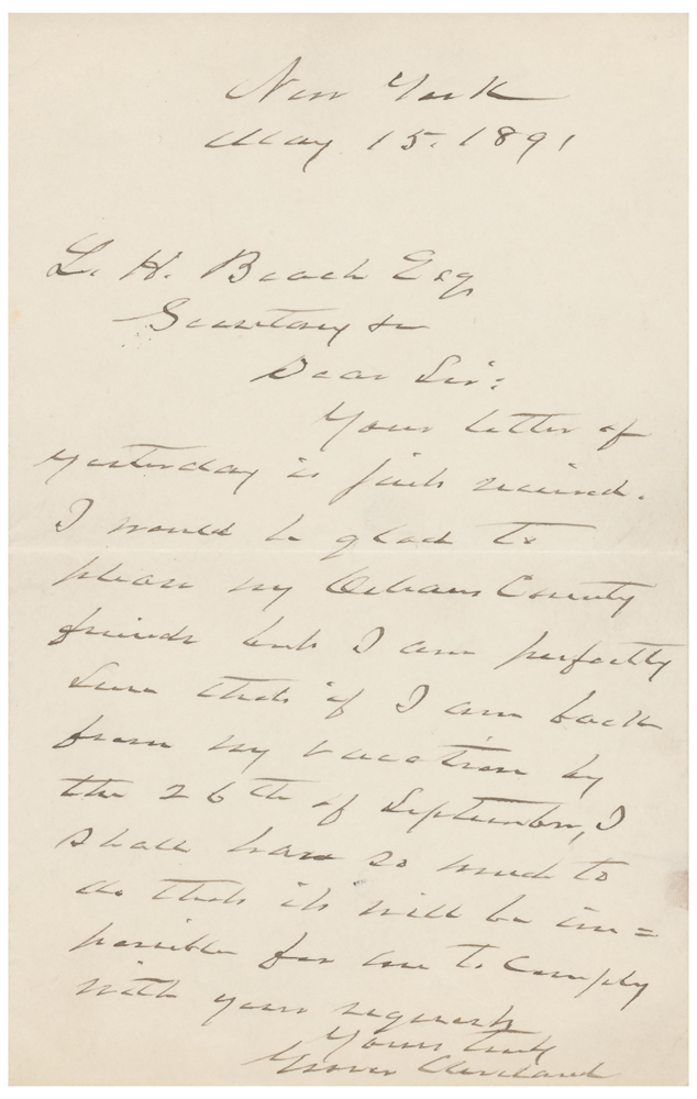 ALS, one page, 4.25 x 7, May 15, 1891. Letter to L. H. Beach, declining an invitation. In part: "I would be glad to please my Orleans County friends but I am perfectly sure that if I am back from my vacation by the 26th of September, I shall have so much to do that it will be impossible for me to comply with your request." In fine condition.