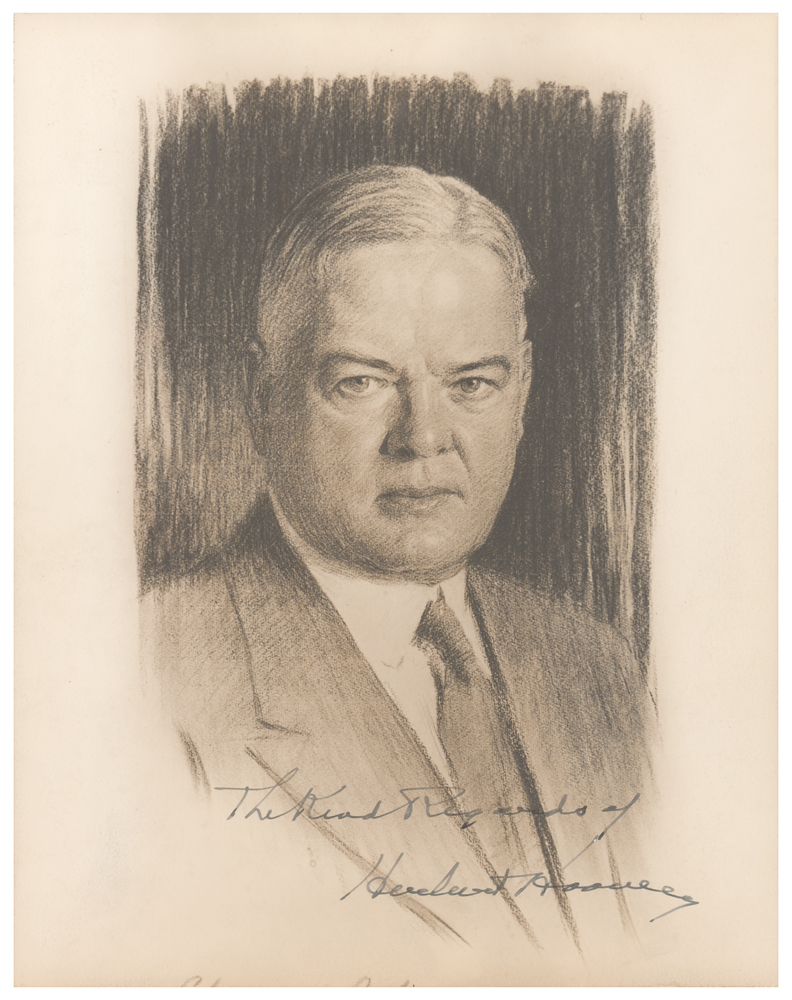 Vintage matte-finish 7 x 9 photo of an artist's portrait of Hoover, signed in fountain pen, "The Kind Regards of Herbert Hoover." In fine condition, with trimmed edges.
