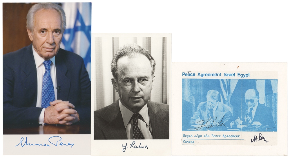 Three items signed by Israeli prime ministers and recipients of the Nobel Peace Prize: a 4.25 x 3.25 clipped image of Menachem Begin and Jimmy Carter signing the Egypt-Israel peace treaty, signed in black felt tip by both; a matte-finish 3.5 x 5.5 photo of Yitzhak Rabin, signed in the lower border in black felt tip; and a color glossy 4 x 6.75 photo of Shimon Peres, signed in the lower border in blue felt tip. In overall fine condition, with a vertical fold to the Begin/Carter image.