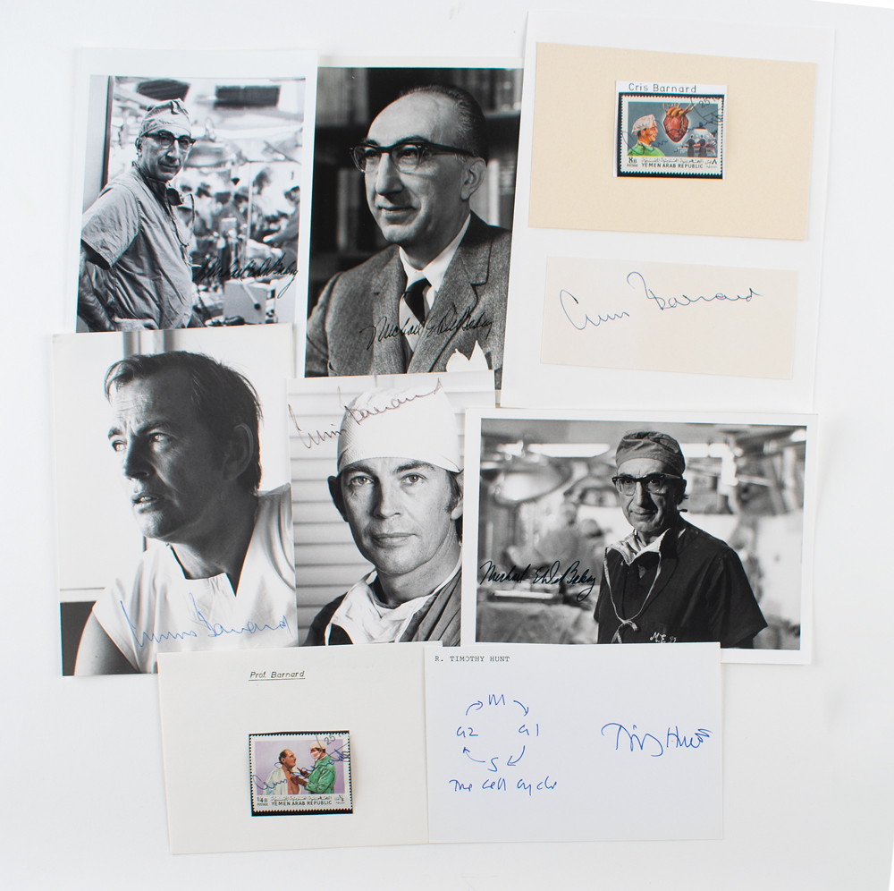 Nine items signed by medical researchers and heart surgeons, including: Christiaan Barnard (2 SPs, 2 stamps, and a signature), Tim Hunt (sketch), and Michael DeBakey (3 SPs). In fine condition.