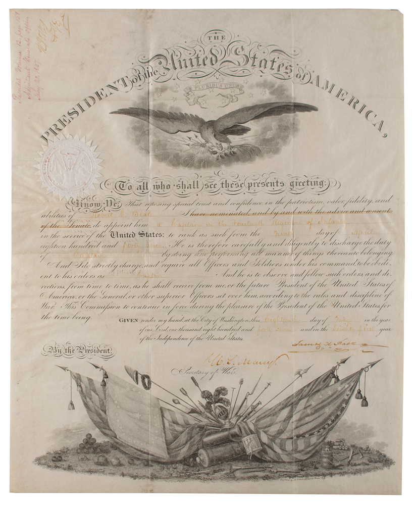 Partly-printed vellum DS as president, one page, 13.5 x 16.75, May 18, 1847. President Polk appoints Robert G. Beale as "a Captain in the Fourteenth Regiment of Infantry in the service of the United States." Signed at the conclusion by President Polk and countersigned by Secretary of War William L. Marcy. The crisply embossed white War Department seal affixed to the upper left remains intact. In very good to fine condition, with the body of the text light, but fully legible.