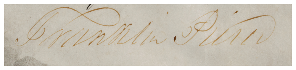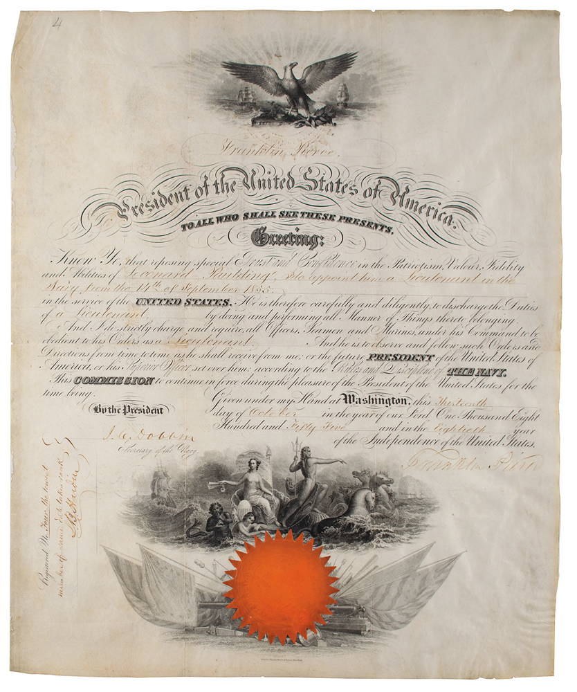 Partly-printed vellum DS as president, one page, 14.5 x 17.75, October 13, 1855. President Pierce appoints Leonard Paulding as a "Lieutenant in the Navy?in the service of the United States." Signed at the conclusion by President Pierce and countersigned by Secretary of the Navy James C. Dobbin. The orange Navy Department seal affixed at the bottom remains fully intact. In fine condition. Paulding died while in command of the USS Wateree in 1867.