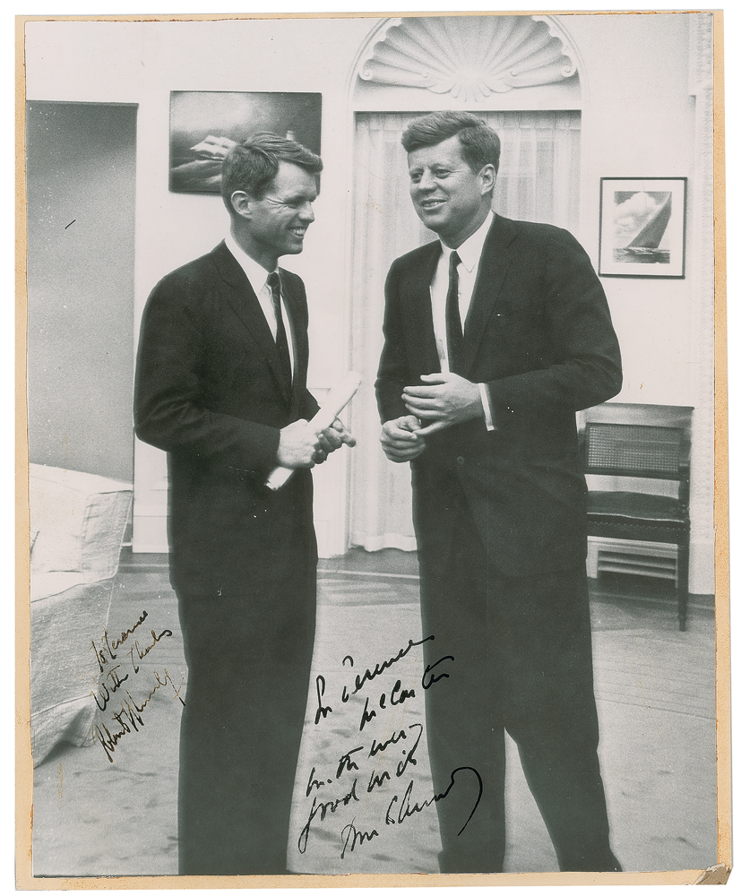 John and Robert are relaxed and smiling, signed and inscribed in fountain pen by both, "To Terence McCarten, with every good wish, John F. Kennedy" and "To Terence, with thanks, Robert F. Kennedy." Original contact sheet with 11 images of John & Robert Kennedy from McCarten's session are included. Terence McCarten was an award-winning news photographer who worked at the N.Y. Herald Tribune and N.Y. Post who met the two brothers while covering the 1960 presidential campaign. An extraordinary image of these American icons and an absolute rarity of great historical significance.