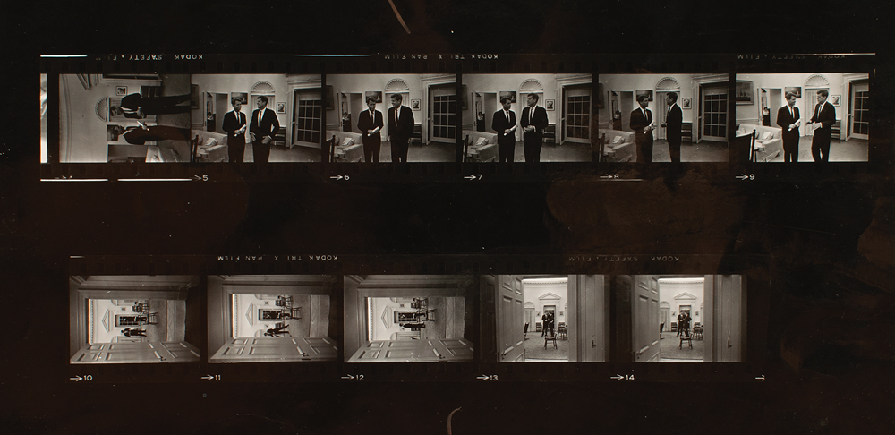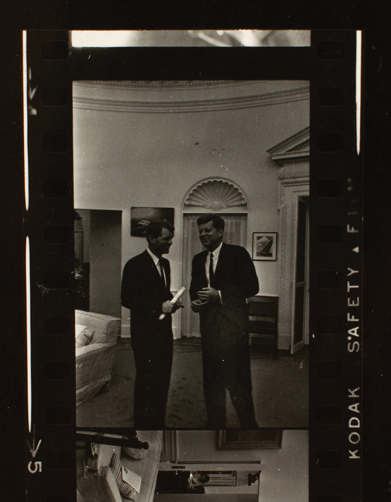7.5″ x 9.5″ glossy black & white photo taken in the Oval Office with McCarten's contact sheet of 11 images. The only known signed photograph of the two brothers alone, signed by both John and Robert Kennedy.