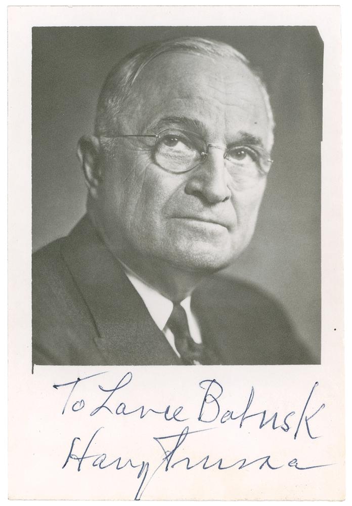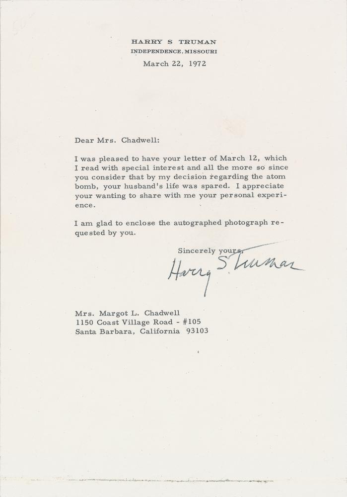 Two signed items, including: a historically significant TLS, one page, 7.25 x 10.5, March 22, 1972, to Mrs. Margot L. Chadwell, in part: "I was pleased to have your letter of March 12, which I read with special interest and all the more so since you consider that by my decision regarding the atom bomb, your husband's life was spared. I appreciate your wanting to share with me your personal experience." Second, a matte-finish 3.5 x 5 head-and-shoulders portrait, signed and inscribed in the lower border in ballpoint, "To Lance Balusk, Harry Truman." Also includes an official double-sided USAAF leaflet in Japanese, 8.5 x 5.5, warning the residents of eleven cities, including Hiroshima and Nagasaki, to flee before the arrival of American bombers. The message reads, in part (translated): "Bombs have no eyes…heed this warning and evacuate these cities immediately." In overall fine condition.