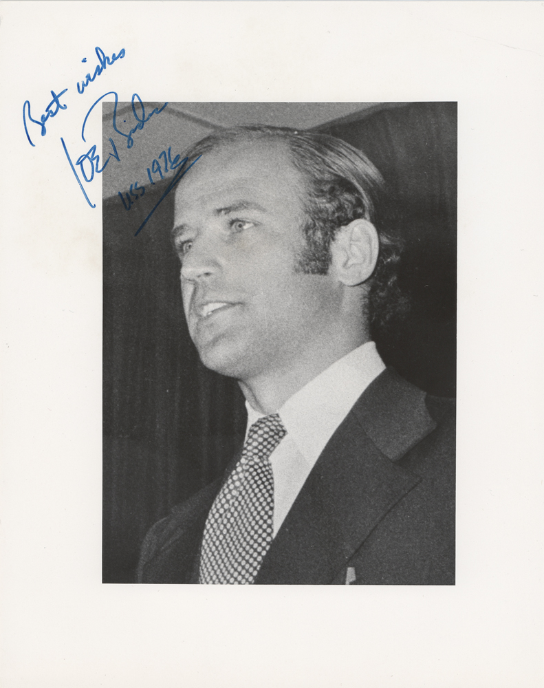 Glossy 8 x 10 photo of Senator Biden early in his political career, signed in blue felt tip, "Best wishes, Joe Biden, USS 1976." In very good to fine condition, with a few small surface impressions, and a crease to the upper right corner.