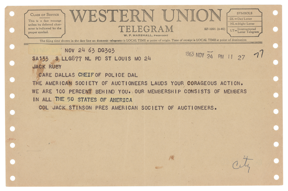 Western Union Telegram sent to Jack Ruby by Col. Jack Stinson, president of the American Society of Auctioneers, one page, 8.5 x 5.5, stamp-dated November 24, 1963. In full: "The American Society of Auctioneers lauds your courageous action. We are 100 percent behind you. Our membership consists of members in all the 50 states of America." This telegram is published in the Investigation of the Assassination of President John F. Kennedy: Hearings Before the President's Commission on the Assassination of President Kennedy, Volume 24, as part of the Warren Commission's Exhibit 2003. In fine condition, with scattered small stains.