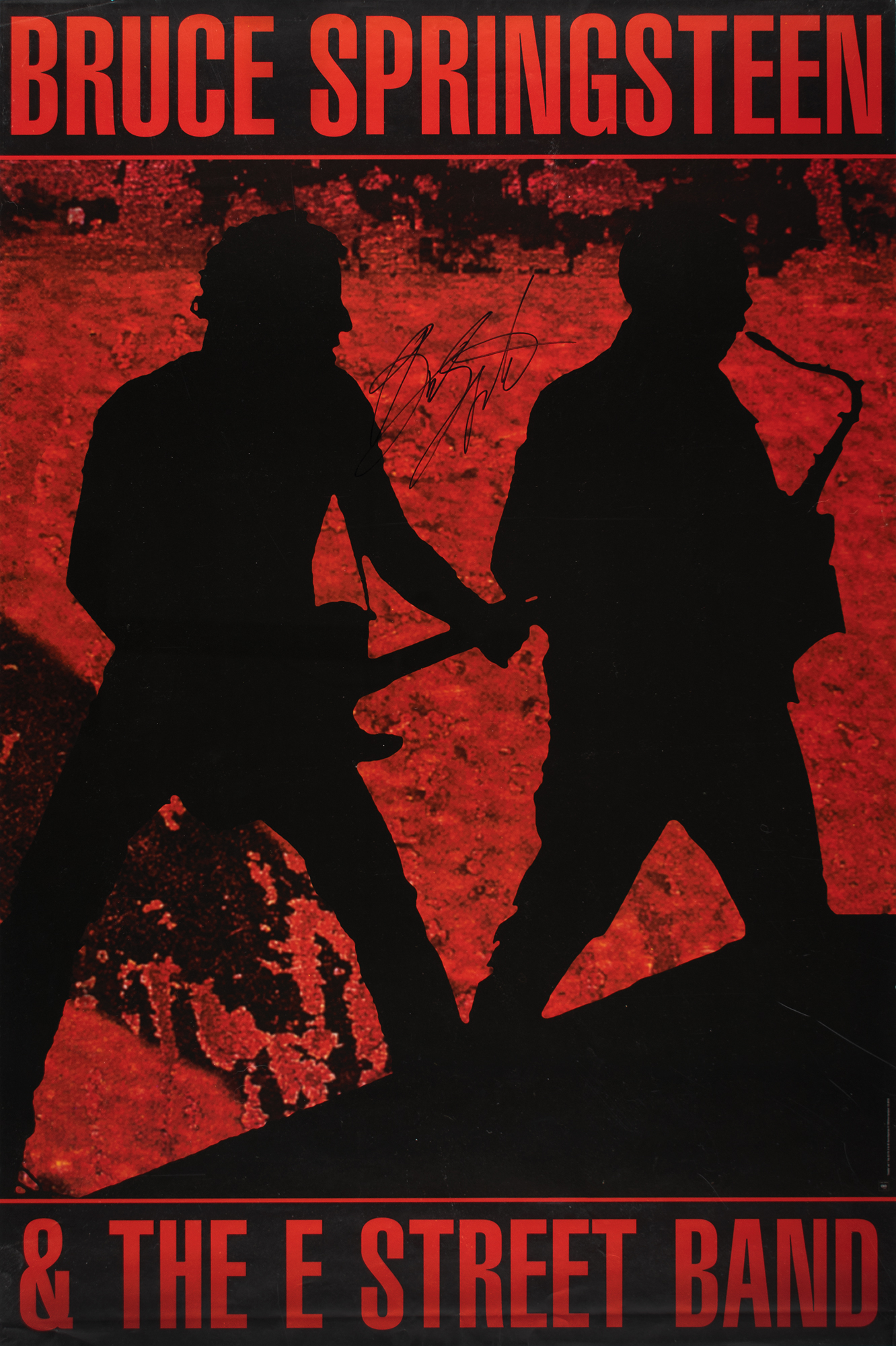 Color 24 x 36 Columbia Records promotional poster for Bruce Springsteen and the E Street Band, which shows silhouettes of Springsteen and Clarence Clemons against a red background, signed prominently in black felt tip by Springsteen. Rolled and in fine condition. Accompanied by a full letter of authenticity from REAL.