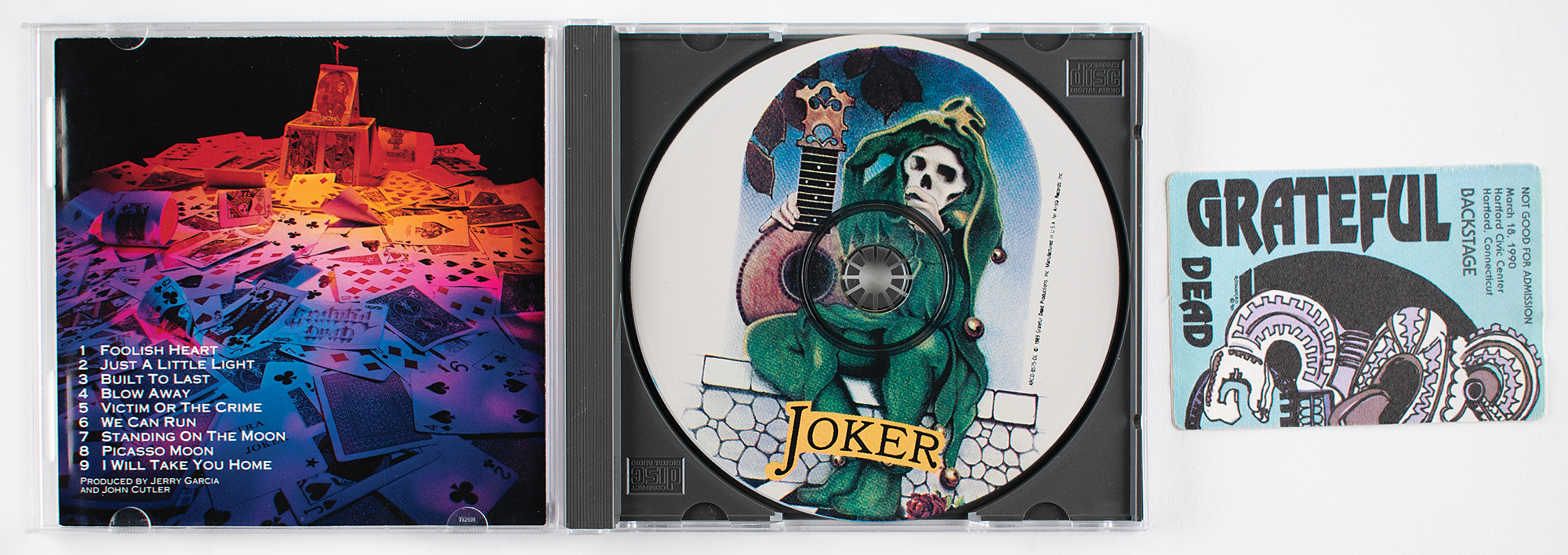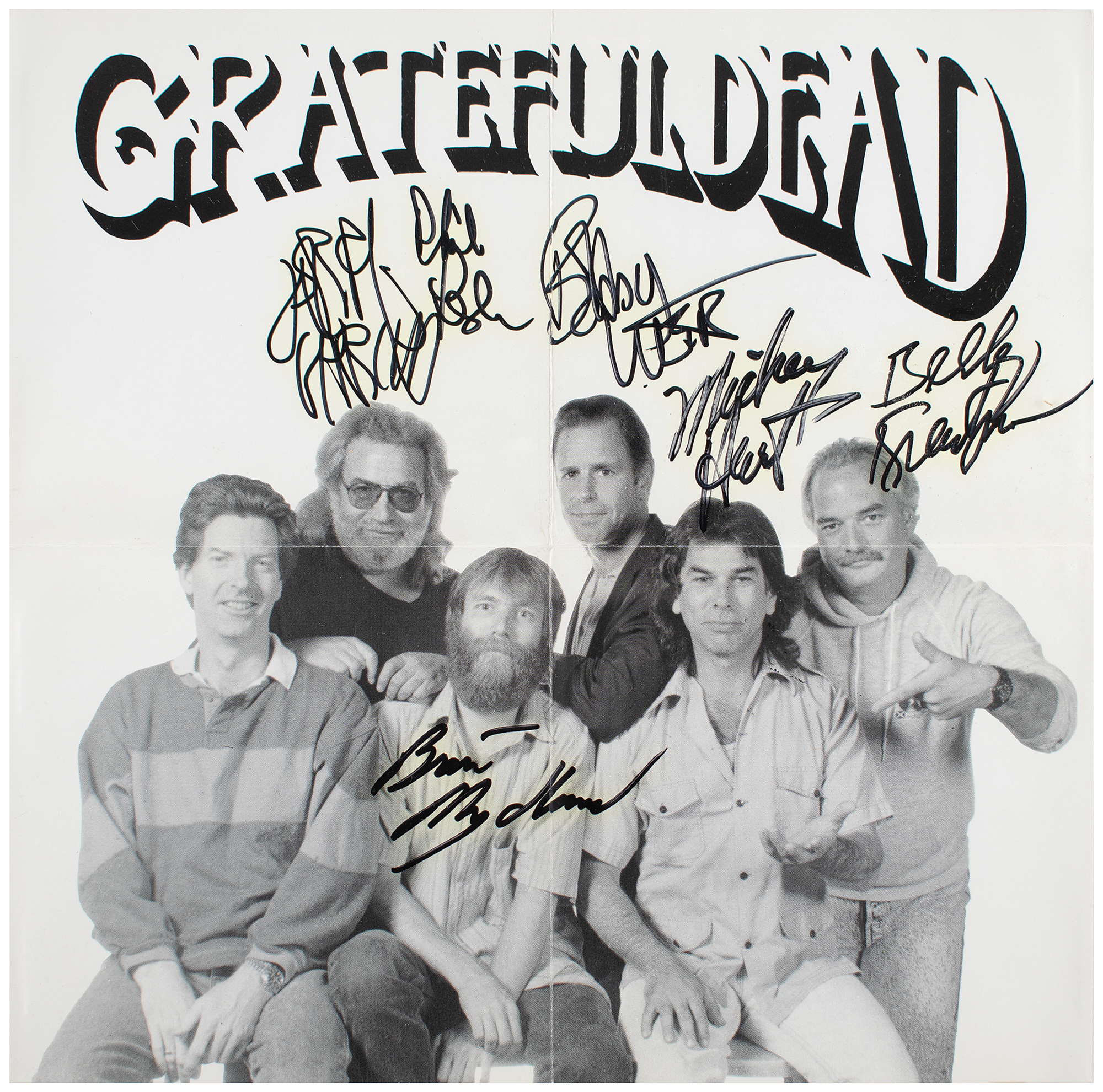 Built to Last CD from the Grateful Dead, signed nicely on the inside of the foldable booklet in black felt tip by Jerry Garcia, Bob Weir, Bill Kreutzmann, Phil Lesh, Mickey Hart, and Brent Mydland. In fine condition, with light yellow haloing to all of the signatures. The CD is included. Accompanied by an unused cloth backstage pass for their show at the Hartford Civic Center on March 18, 1990, where the consignor indicates that the autographs were obtained.