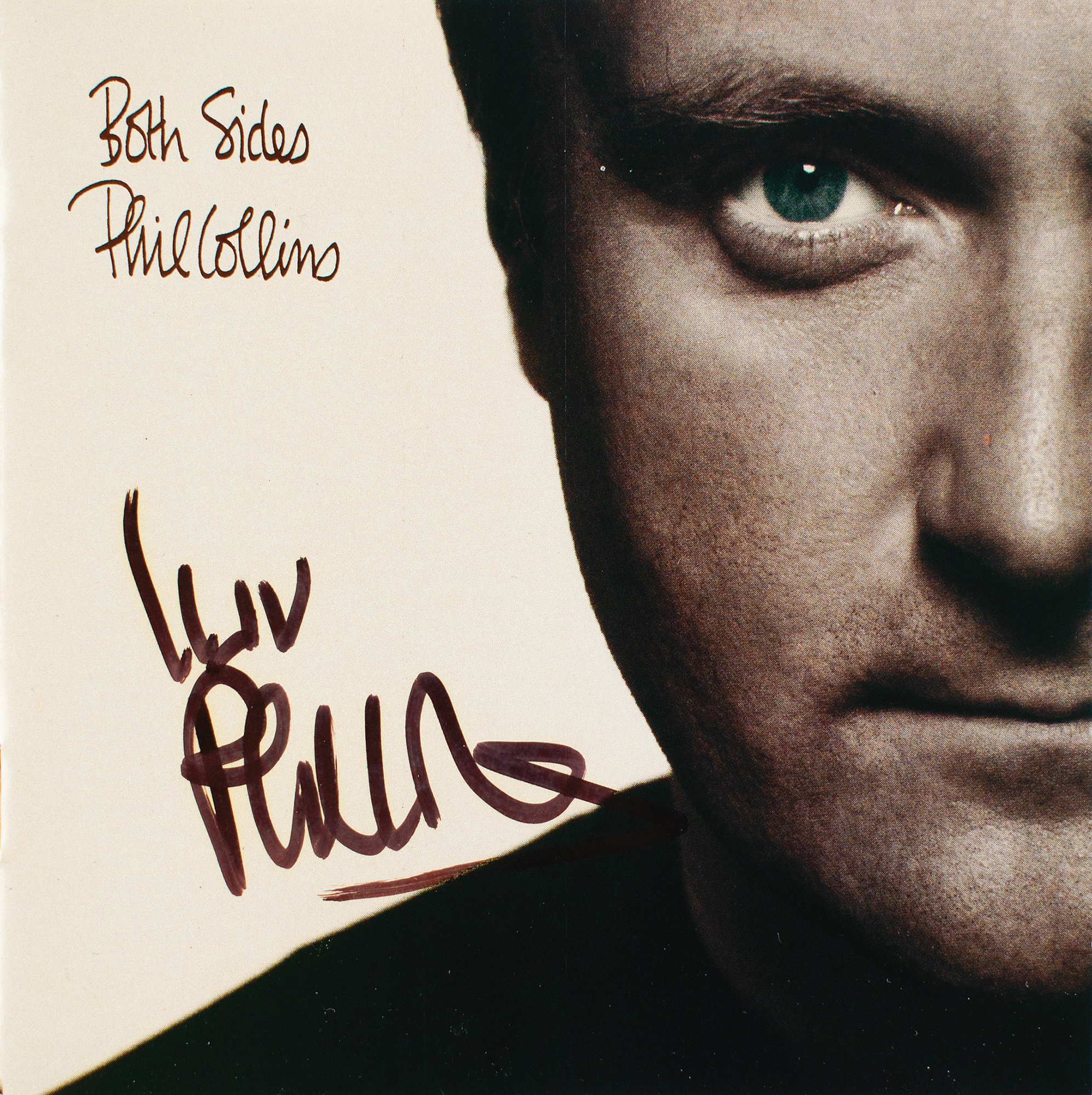 Both Sides CD by Phil Collins, signed on the front cover in black felt tip, "Love, Phil Collins." In fine condition. The CD is included. Accompanied by an unused cloth backstage pass for his 'Both Sides of the World Tour,' dated to his show at the Hartford Civic Center on July 5, 1994, where the consignor indicates that the autograph was obtained.