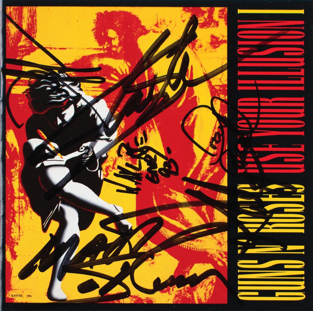 Use Your Illusion CD by Guns N' Roses, signed on the front cover in black felt tip by W. Axl Rose, Slash, Gilby Clarke, Duff McKagan, Matt Sorum, and Dizzy Reed. In fine condition. The CD is included. Accompanied by a 'working personnel' backstage pass for the band's 'Use Your Illusion Tour,' dated to a show at The Ritz in New York City on May 16, 1991, where the consignor notes the signatures were obtained.