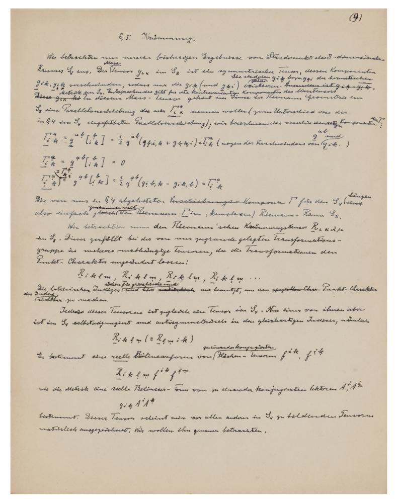 Important scientific manuscript written in the hand of Albert Einstein in German, unsigned, one page, 8.5 x 11, no date circa 1945. A draft variant of page 9 of the manuscript of 'Auf die Theorie metrischer komplexer Raume gegründete Feldtheorie' ('A Field Theory Based on the Theory of Complex Metric Spaces'), the initial version of the article 'A Generalization of the Relativistic Theory of Gravitation,’ published in Annals of Mathematics, Vol. 46 (Oct. 1945), pp. 578-584. Headed "Krümmung [Curvature]," the piece concludes (translated): "This tensor seems to me to be excellent above all other tensors to be formed in S4. We want to take a closer look at it." In differential geometry, the Einstein tensor, also known as the trace-reversed Ricci tensor, is used to express the curvature of a pseudo-Riemannian manifold. In general relativity, it occurs in the Einstein field equations for gravitation that describe spacetime curvature in a manner that is consistent with conservation of energy and momentum. In fine condition.