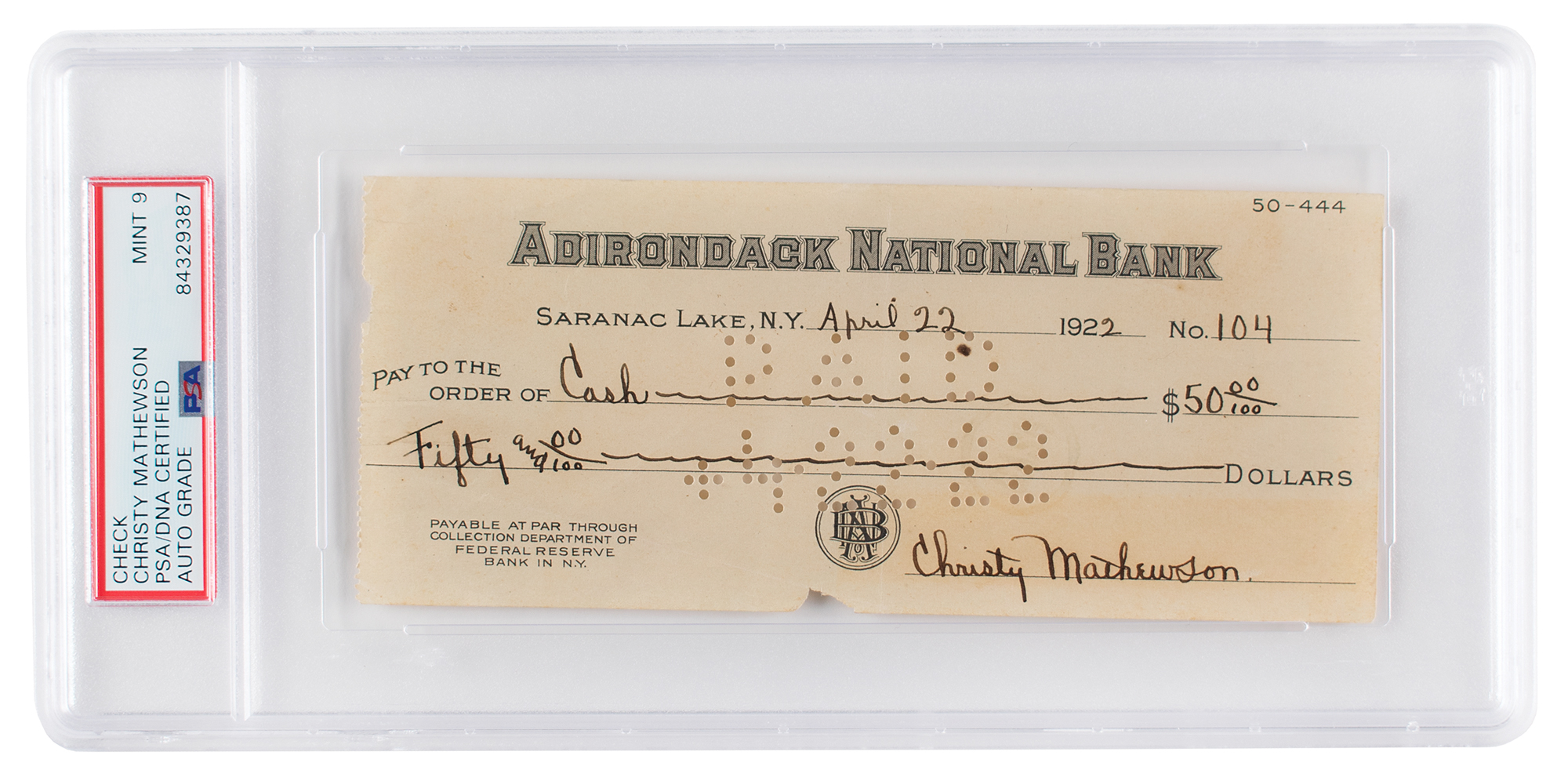 Adirondack National Bank check, 6.5 x 2.75, filled out and signed by Christy Mathewson, payable to cash for $50, April 22, 1922. In fine condition, with two small areas of edge paper loss. Encapsulated in a PSA/DNA authentication holder, grading the autograph as "MINT 9."