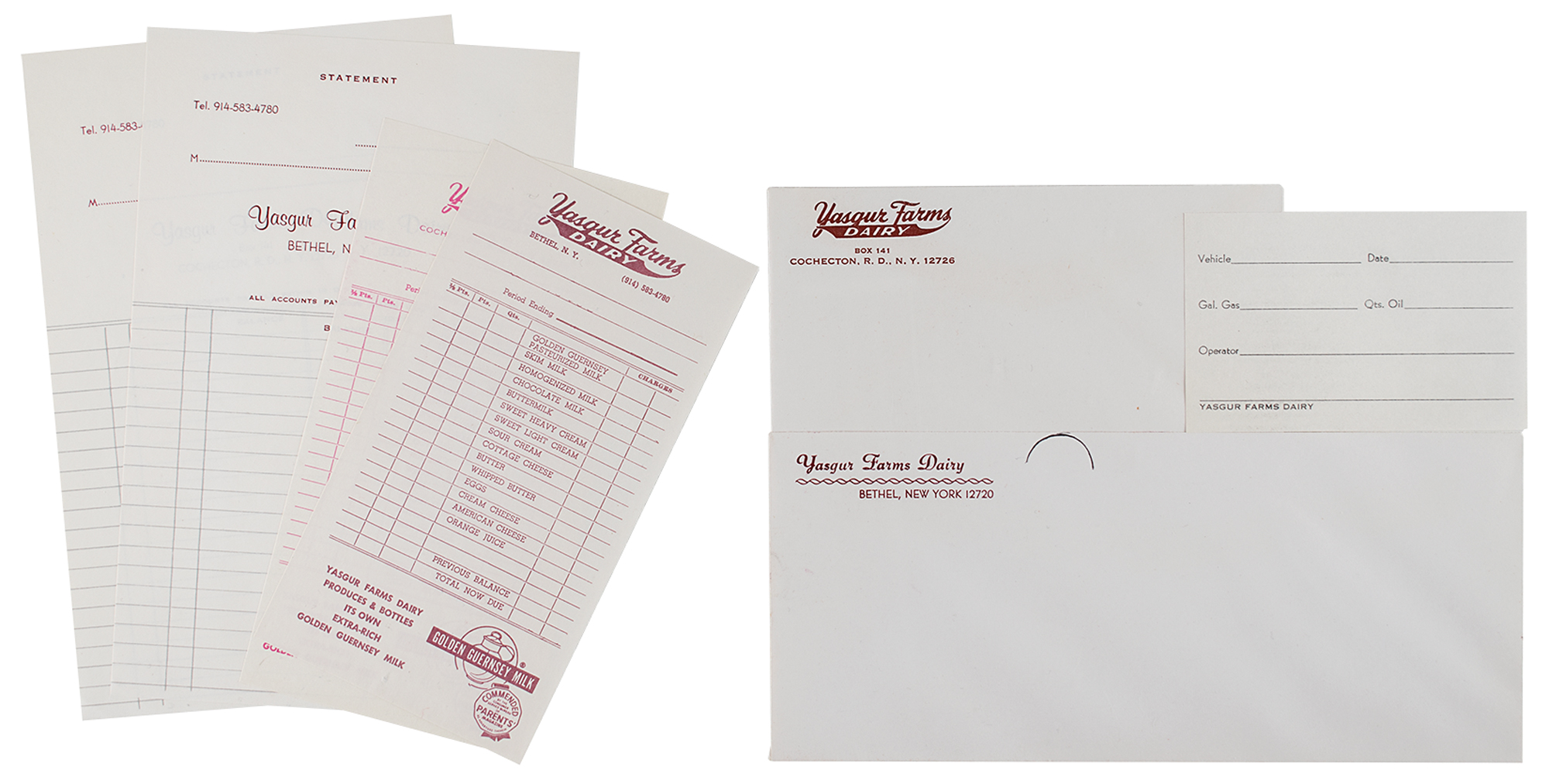 Seven pieces of stationery from Yasgur Farms Dairy of Bethel, New York, whose owner, Max Yasgur, rented out a portion for his 600-acre farm to the organizers of the Woodstock Music and Arts Fair for $10,000. The lot includes: two sealed mailing envelopes, four statement or order forms, and one vehicle fuel form. In overall fine condition. Accompanied by a certificate of authenticity from Tracks.