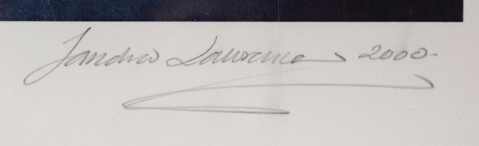 Attractive limited edition color 30.5 x 33 silkscreen print showing Led Zeppelin's Page playing his Les Paul electric guitar, numbered 236/300, signed in the lower border in pencil, "Jimmy Page." Also signed in pencil by the artist, "Sandra Lawrence, 2000." Rolled and in fine condition. Accompanied by a certificate of authenticity from Tracks.