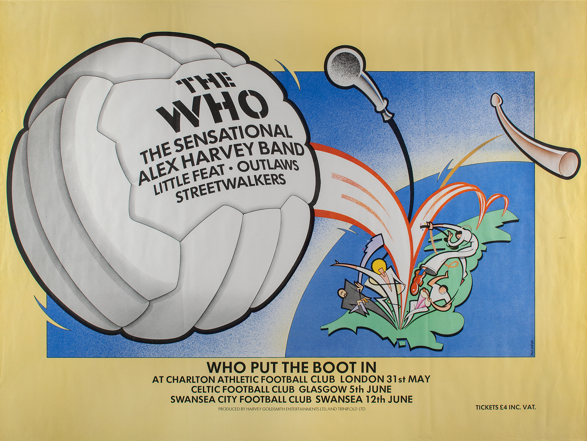 Original color 40 x 30 poster for a series of concerts by The Who as part of the ‘Who Put the Boot In’ tour in 1976, which featured shows at the Charlton Athletic Football Club in London on May 31st, the Celtic Football Club in Glasgow on June 5th, and the Swansea City Football Club in Swansea on June 12th. Rolled and in fine condition. Accompanied by a certificate of authenticity from Tracks.