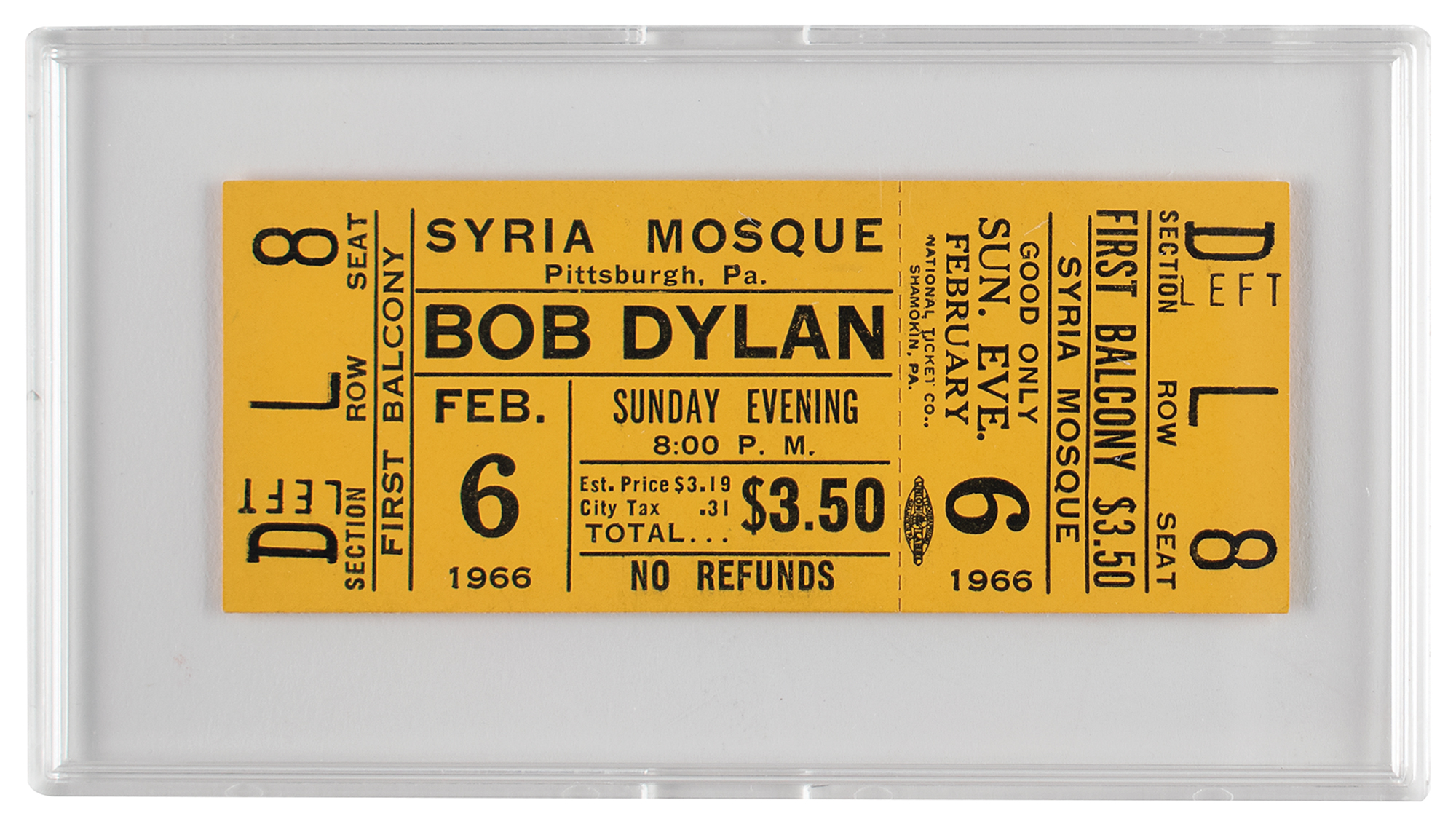 Desirable original unused 3.75 x 1.5 ticket for a Bob Dylan concert at the Syria Mosque in Pittsburgh, Pennsylvania, on February 6, 1966, issued “Section D Left, Row L, Seat 8.” In fine condition. Accompanied by a certificate of authenticity from Tracks.