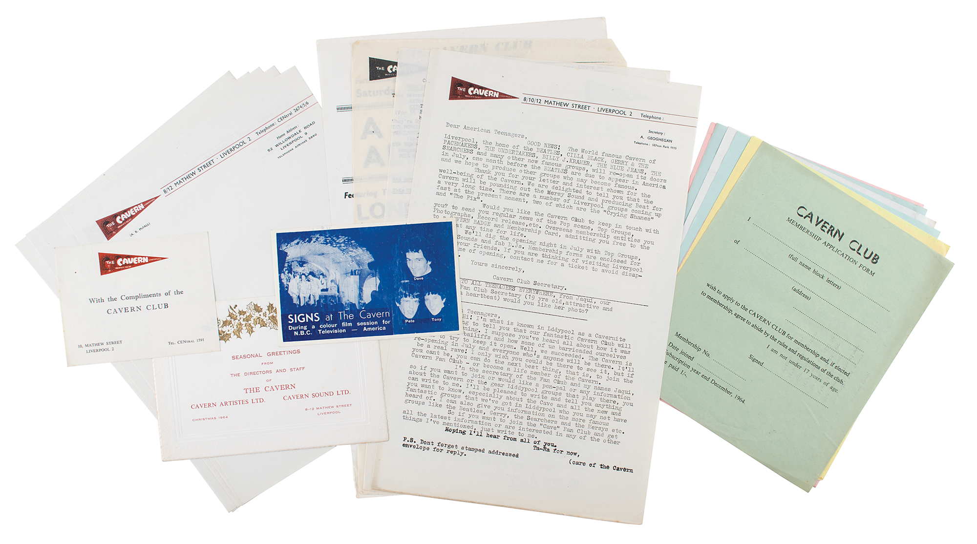 Collection of 1960s memorabilia from Liverpool’s famed underground music venue, the Cavern Club. The lot, which contains 19 items, consists of: a compliments slip; a promotional card for the band Signs; a Christmas card from 1964; a group of five membership application forms from 1964-1966, two of which have been completed in ballpoint; a pair of junior membership application forms; five sheets of unused 8 x 10 letterhead; three newsletters from 1964; and an 8.5 x 13.5 handbill for ‘A Fabulous All Nighter’ featuring a performance by Long John Baldry on July 24th, and listing Rod Stewart. In overall fine condition, with some wear and creases. Accompanied by a certificate of authenticity from Tracks.