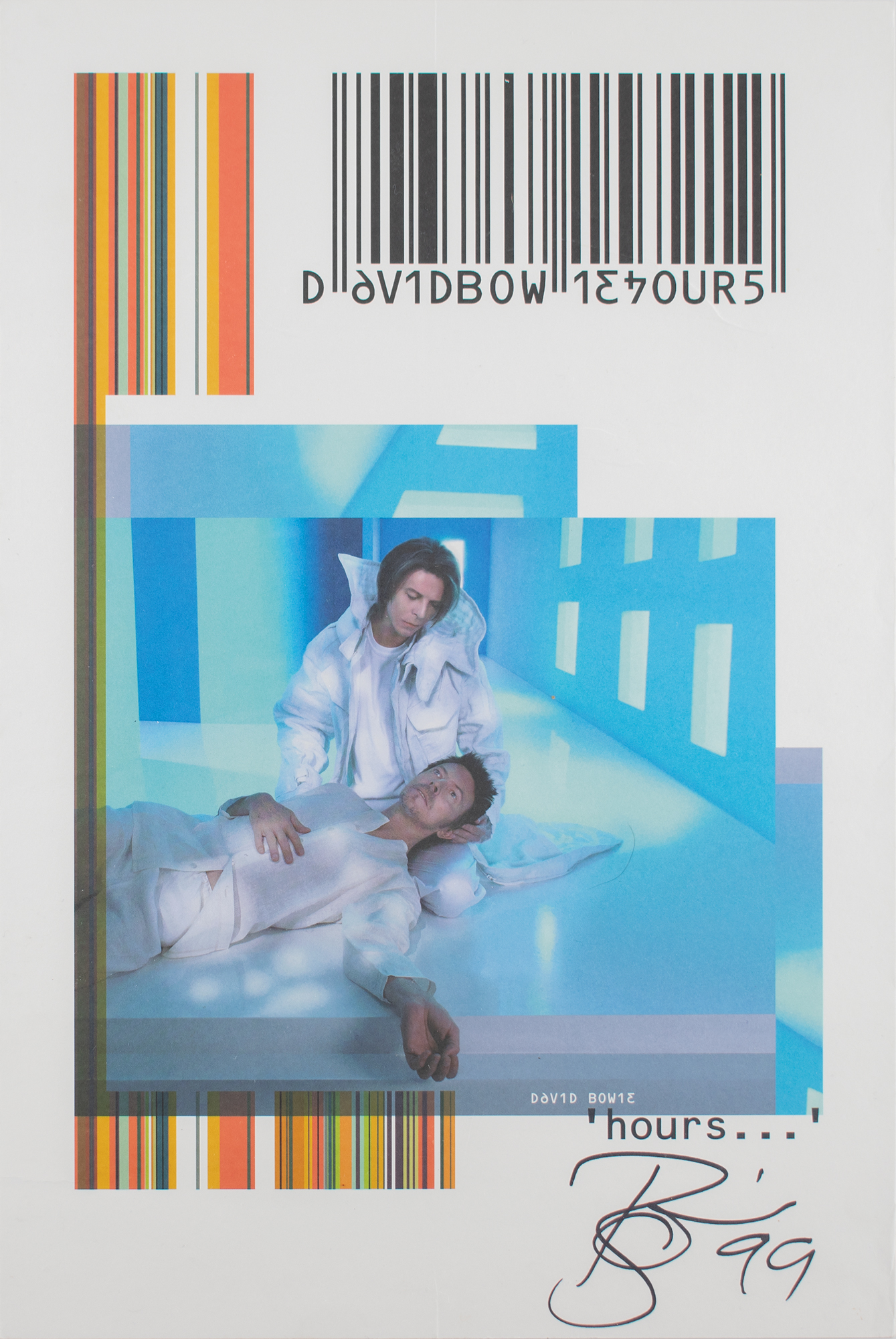 Promotional color 12 x 18 mini poster for David Bowie’s 1999 studio album ‘Hours,’ signed in black felt tip, “Bowie, ‘99.” In very good to fine condition, with some creasing to the top. Accompanied by a certificate of authenticity from Tracks.