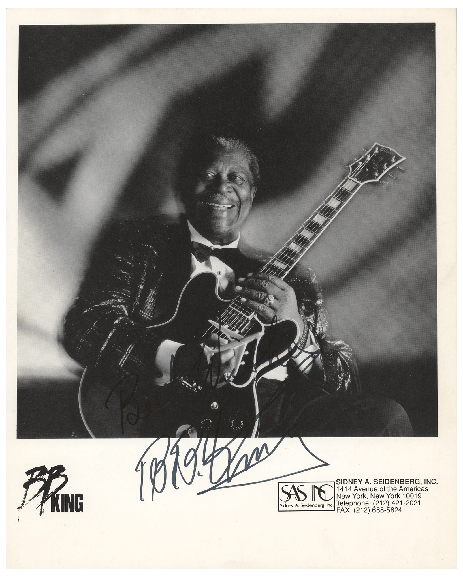 Glossy 8 x 10 publicity photo of King posing with his beloved Gibson guitar Lucille in a half-length pose, signed in black felt tip, "Best wishes, B. B. King." In fine condition, with a few small surface creases. Accompanied by a certificate of authenticity from Tracks.