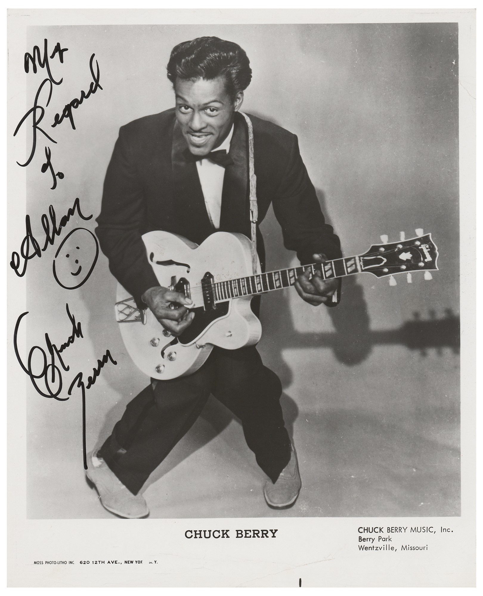Glossy 8.25 x 10.25 publicity photo of Berry playing his guitar in a hunkered down full-length pose, signed and inscribed in black felt tip, "My regard to Allan, Chuck Berry," who adds a smiley face. In very good to fine condition, with scattered creasing, and a short tear to the right edge. Accompanied by a certificate of authenticity from Tracks.