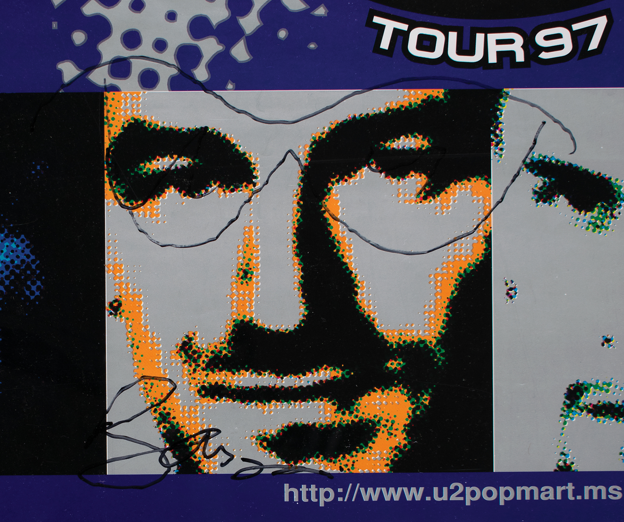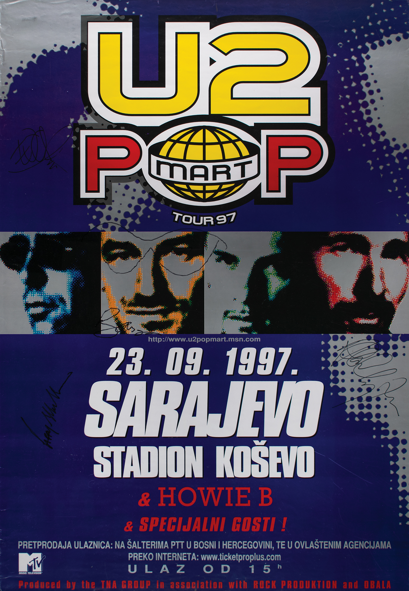 Color 26.75 x 38.5 poster for a U2 concert at Kosevo Stadium in Sarajevo, Bosnia and Herzegovina, on September 23, 1997, as part of their PopMart Tour, signed in black felt tip by Edge, Adam Clayton, Larry Mullen, Jr., and Bono, who adds glasses to his image. Rolled and in fine condition, with some light edge creasing. Accompanied by a certificate of authenticity from Tracks.