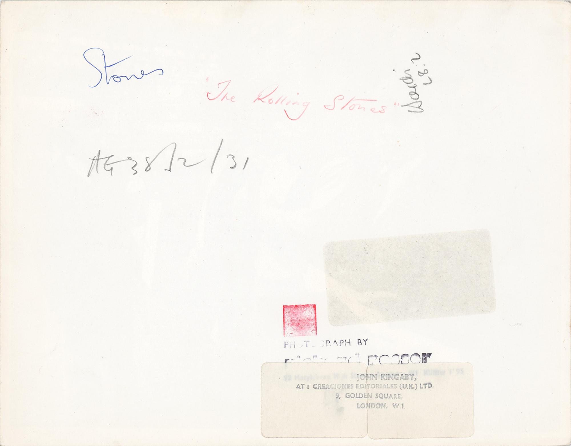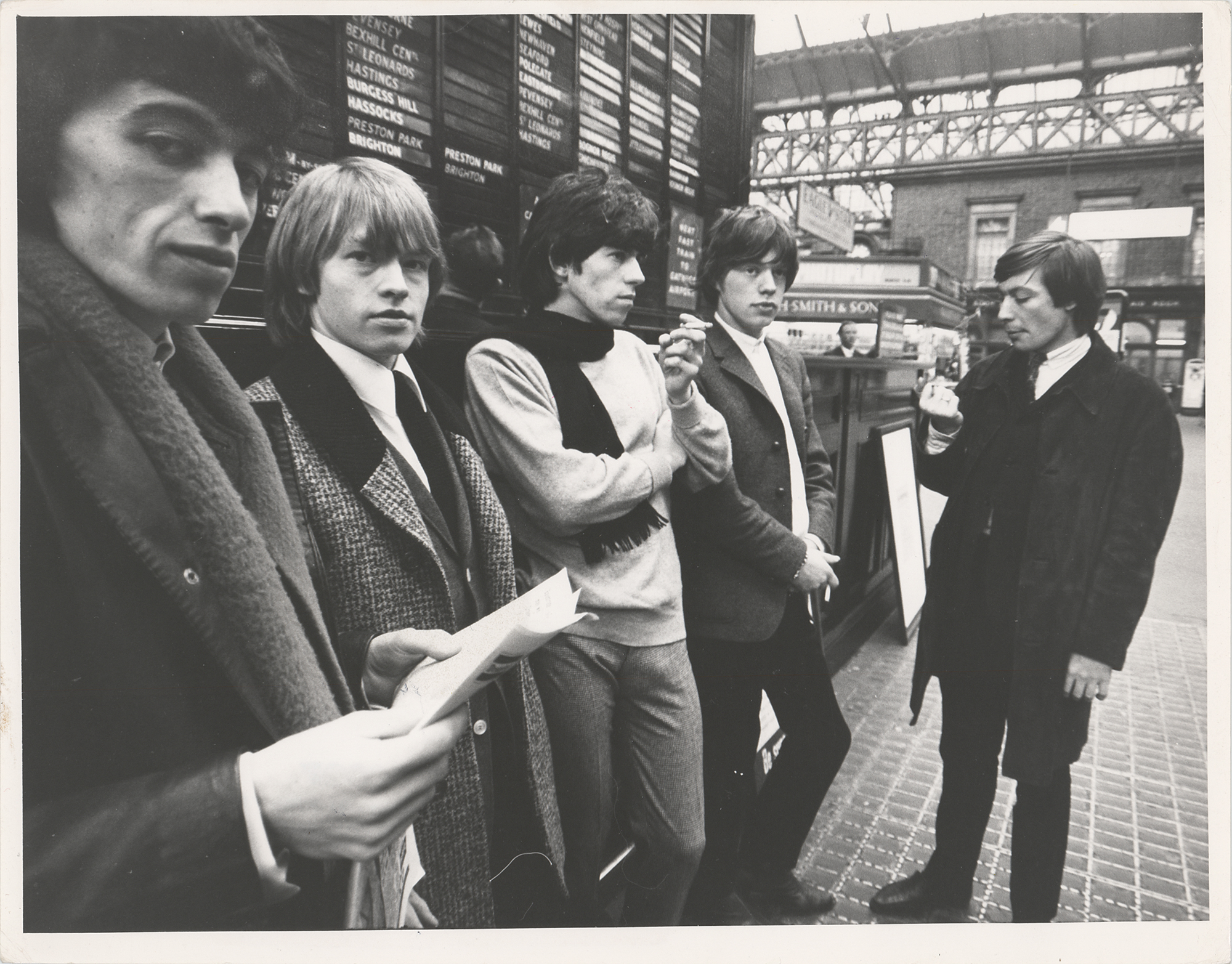 Vintage glossy 10.25 x 8 photo of the Rolling Stones that was taken by Richard Rosser during a photo session in London on October 11, 1964. The image shows the band patiently waiting for a train at Victoria Station. Reverse bears a Rosser photo stamp and a John Kingaby label. In fine condition. Accompanied by a certificate of authenticity from Tracks.
