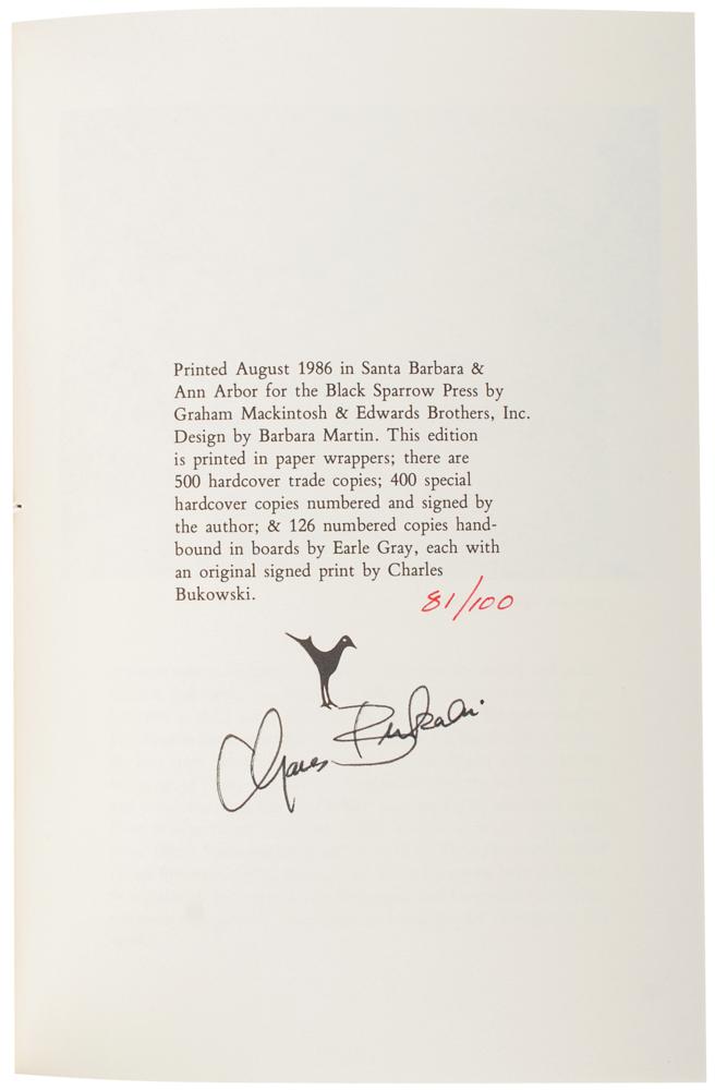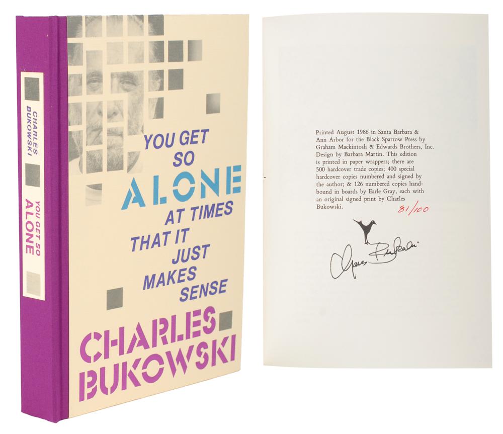Signed book: You Get So Alone at Times That It Just Makes Sense. First edition, limited issue, numbered 81/100. Santa Rosa: Black Sparrow Press, 1986. Hardcover handbound in boards by Earle Gray, 6.25 x 9.25, 313 pages. Signed on the colophon in black felt tip by Bukowski, "Charles Bukowski," and also signed in black felt tip, "Buk, 7/86," on an original color print bound into this version of the book. In fine condition.
