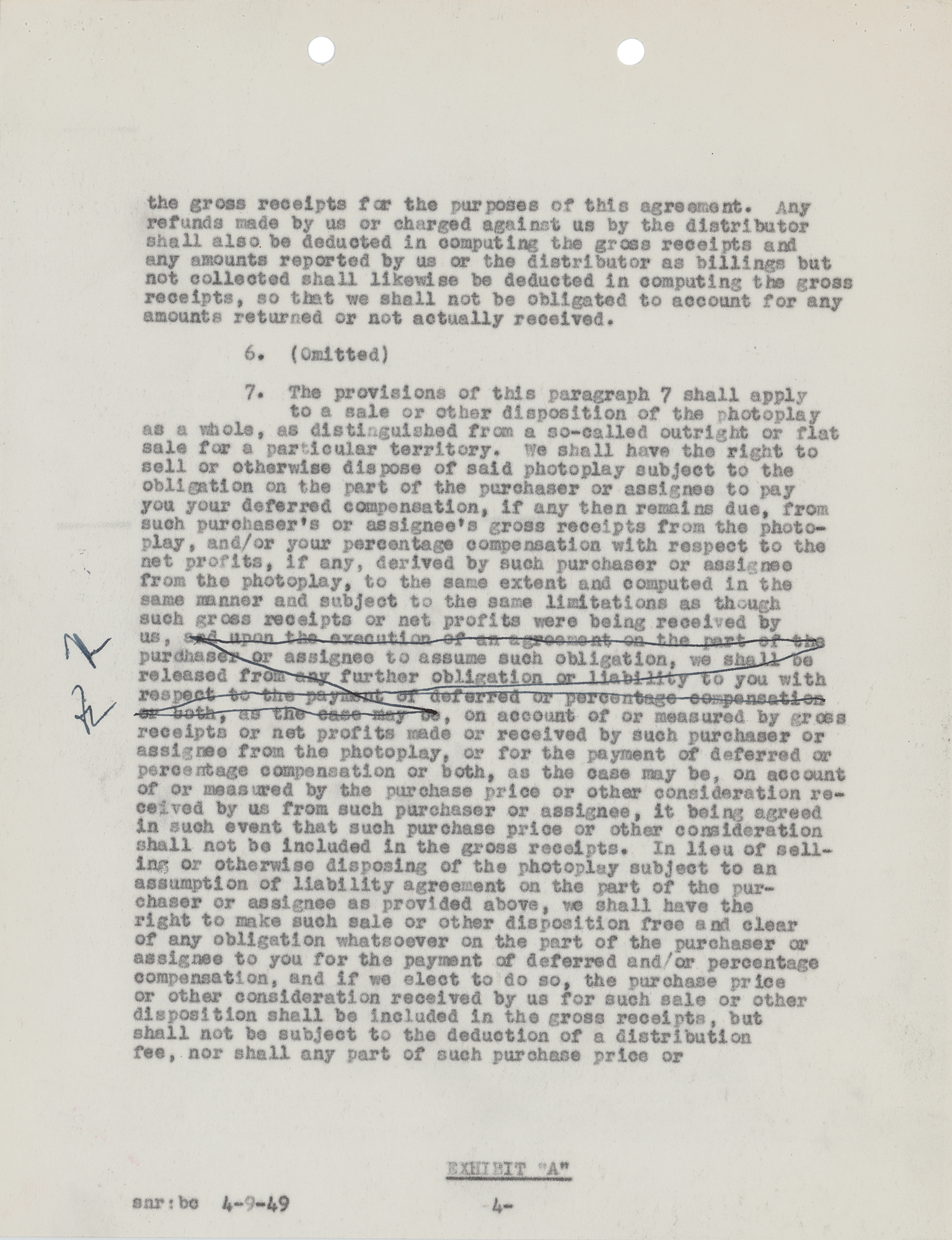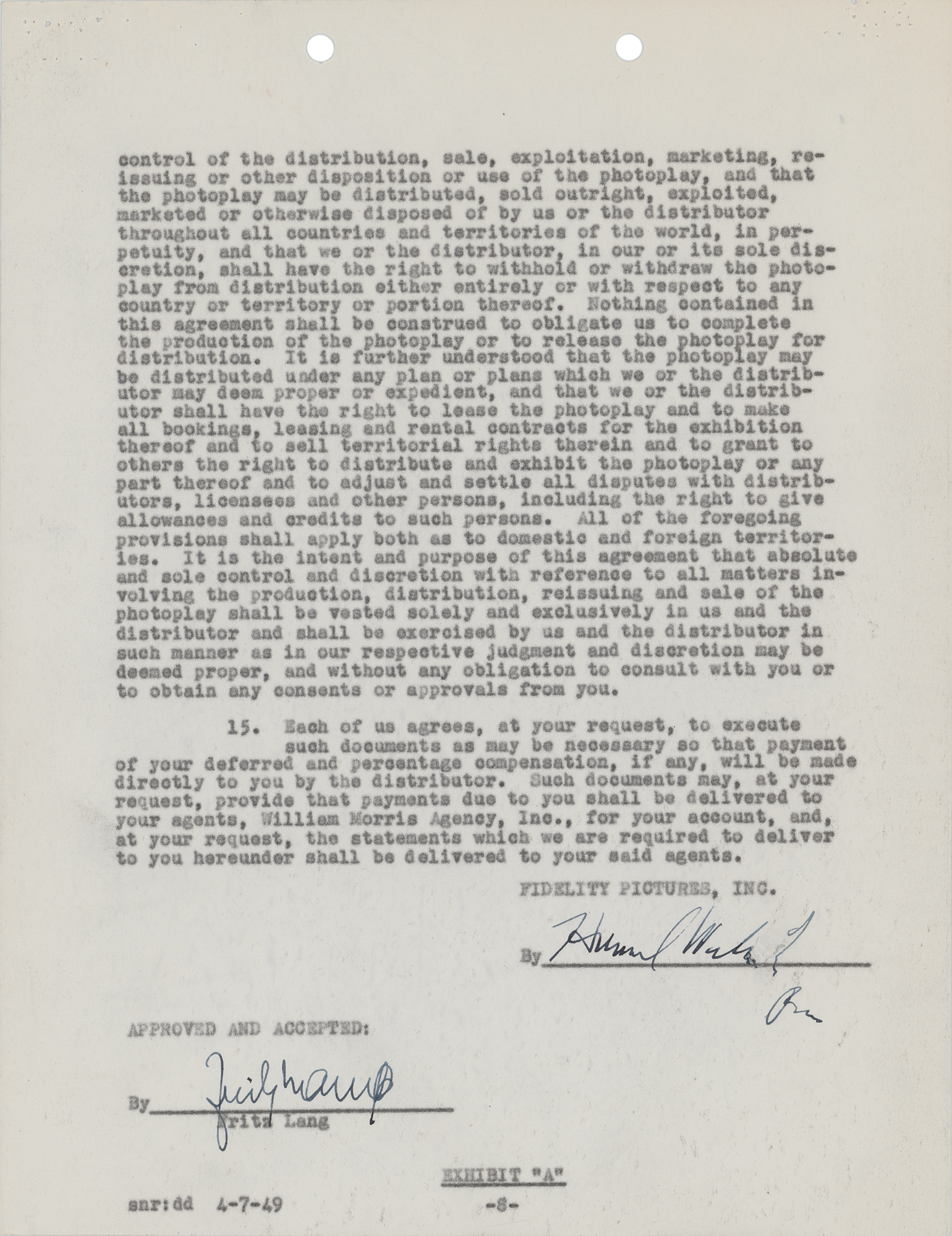 DS, eight pages, 8.5 x 11, April 7, 1949. An 'Exhibit A' agreement that originally accompanied a larger document concerning Lang and Fidelity Pictures, mainly defining what is meant by "gross receipts" and pertaining to the financial technicalities of an unspecified film. Signed on the last page in fountain pen by Fritz Lang, who adds his initials twice to corrections on the fourth page. In fine condition, with a small tear to last page. Lang's only interaction with low-budget production company Fidelity Pictures was the direction of their largely forgotten film noir House by the River, which was distributed by Republic Pictures and released in 1950. The film starred Louis Hayward, Lee Bowman, Jane Wyatt, and Dorothy Patrick. Accompanied by a DVD of the aforementioned film, which calls it "Fritz Lang's Gothic Mystery."