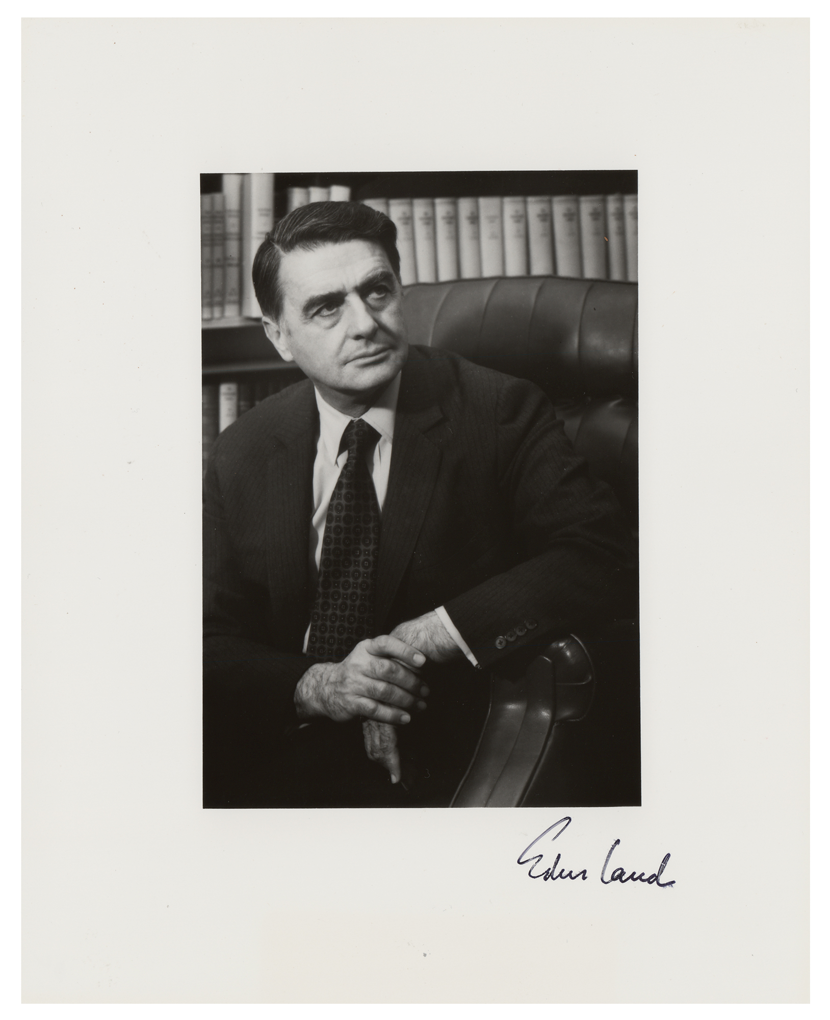 American scientist and inventor (1909-1991) who pioneered inexpensive polarizing filters and, with his development of 'instant' photography, built his company, Polaroid, into an industry giant. Glossy 8 x 10 photo of Land sitting in a chair, signed in the lower border in black felt tip. Reverse bears an affixed photo caption. In fine condition, with a faint paperclip impression to the top edge.