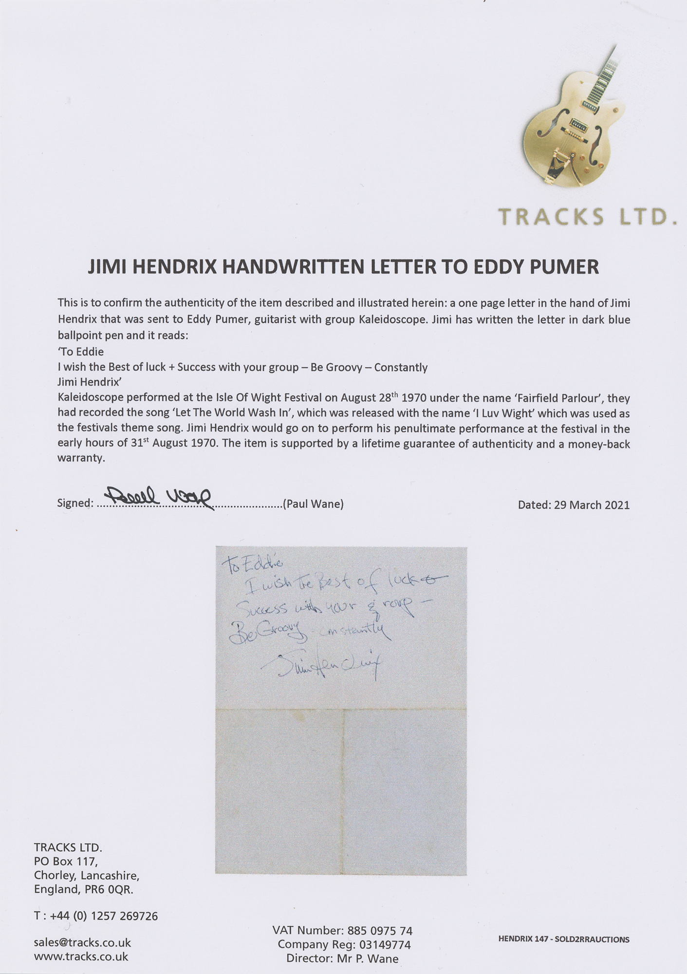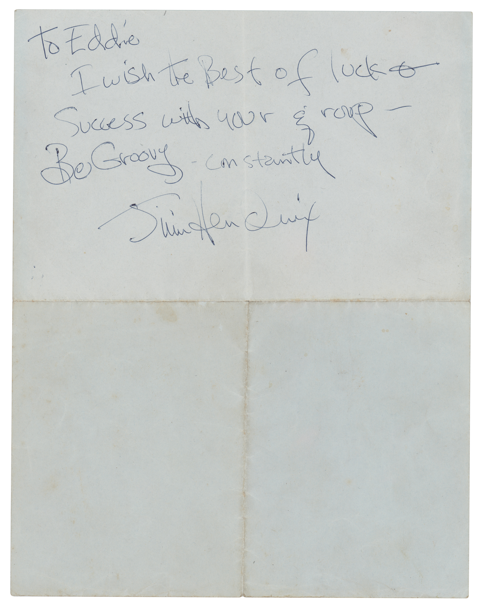 Ballpoint signature and inscription, "To Eddie, I wish the Best of luck & Success with your group—Be Groovy—constantly, Jimi Hendrix,” on an off-white 7 x 9 sheet. In fine condition, with light handling wear and a central vertical fold. Accompanied by a certificate of authenticity from Tracks.