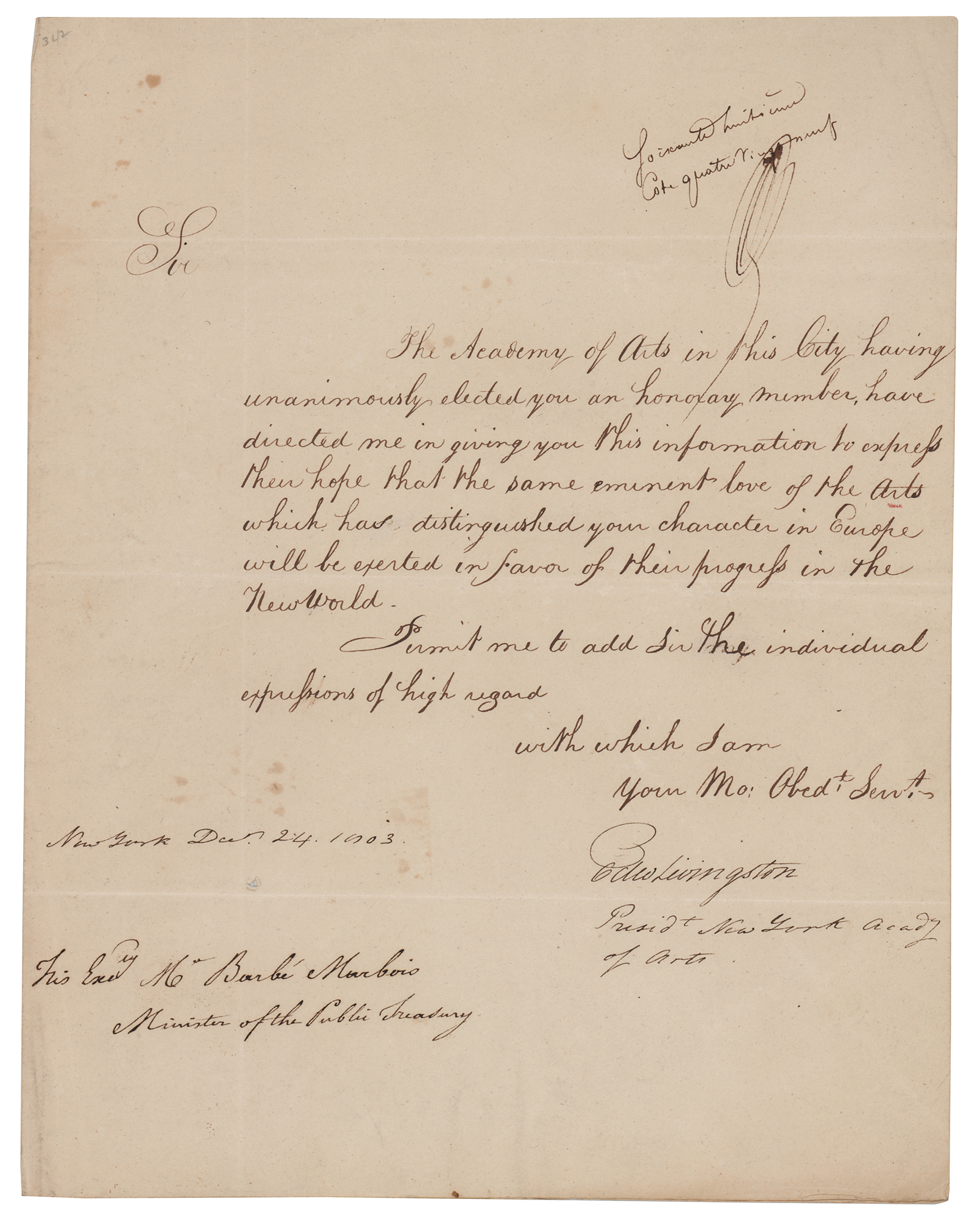 American statesman (1764-1836) who helped draft the Louisiana Civil Code and served as Andrew Jackson's secretary of state. LS signed “Edw. Livingston, Presid't New York Acad'y of Arts,” one page, 7.75 x 9.75, December 24, 1803. Letter to French Minister of the Treasury Francois Barbe-Marbois, in part: "The Academy of Arts in this City having unanimously elected you an honorary member, have directed me in giving you this information to express their hope that the same eminent love of the Arts which has distinguished your character in Europe will be exerted in favor of their progress in the New World." In fine condition. An interesting association piece, as Livingston's older brother, Robert R. Livingston, had negotiated the Louisiana Purchase with Barbe-Marbois earlier in 1803.