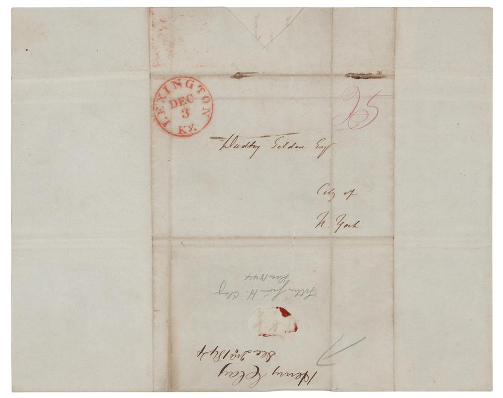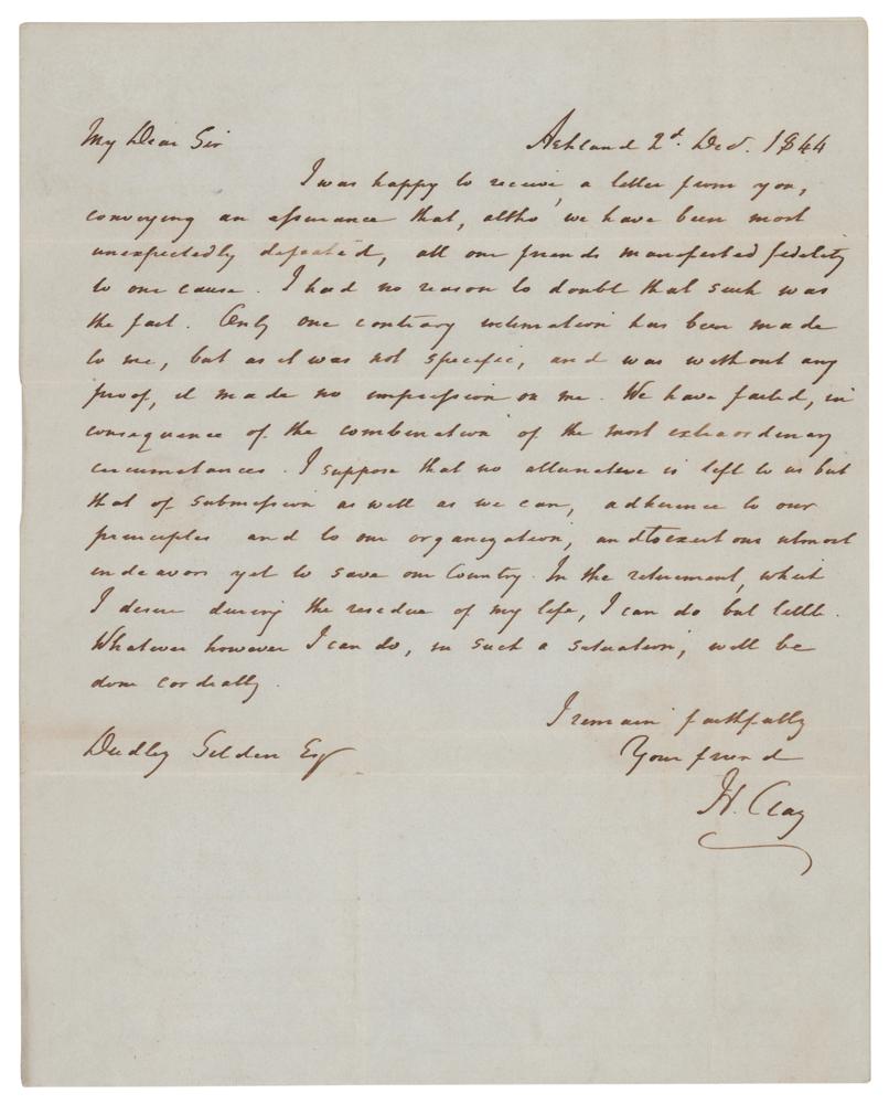 ALS signed “H. Clay,” one page, 7.75 x 9.75, December 2, 1844. Handwritten letter to Dudley Selden, despairing over being “unexpectedly defeated” by James K. Polk in the 1844 presidential election. In part: "I am happy to receive a letter from you, conveying an assurance that, altho' we have been most unexpectedly defeated, all our friends manifested solidarity to one cause. I had no reason to doubt that such was the fact?We have failed, in consequence of the most extraordinary of circumstances. I suppose that no alternative is left to us but that of submission as well as we can, adherence to our principles and to one organization, and to exert one utmost endeavor yet to save our country." In fine condition. Democratic nominee James K. Polk won by a mere 5,106 votes out of 470,062 cast in New York, and only 3,422 out of 52,096 votes in Michigan. Had enough of these voting blocks cast their ballots for the anti-annexationist Clay in either state, he would have defeated Polk.