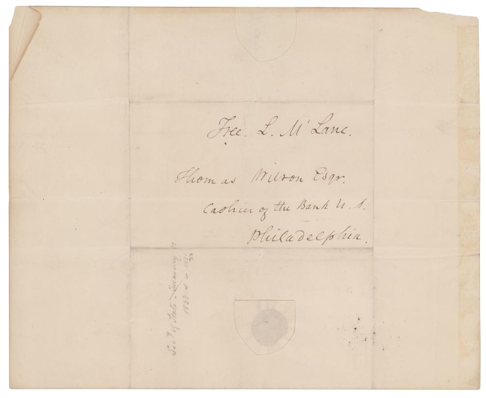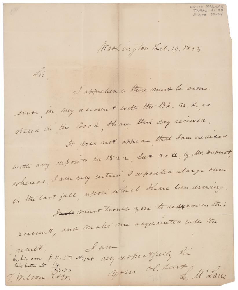 American lawyer and politician (1786-1857) who served as Andrew Jackson's Secretary of State and figured prominently in the 'Bank War.' ALS signed “L. McLane,” one page, 8 x 10, February 19, 1823. Letter to Thomas Wilson, Cashier of the Bank of the United States at Philadelphia, disputing a bank statement. In part: "I apprehend there must be some error, in my account with the Bk. U. S., as stated in the Book, I have this day received. It does not appear, that I am credited with any deposits in 1822, but 20$, by Mr. Dupont, whereas I am very certain I deposited a large sum in the last fall, upon which I have been drawing. I must trouble you to reexamine this account, and make me acquainted with the result." Addressed in the integral lead in McLane's hand, and franked "Free, L. McLane" in the upper right. In fine condition.