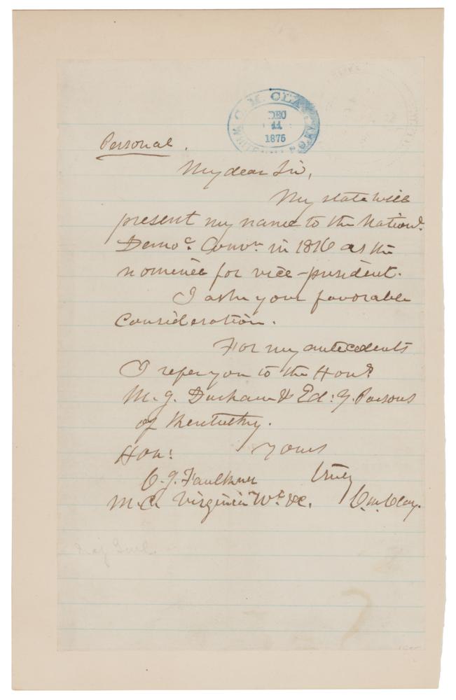 Prominent abolitionist leader (1810-1903) known as the 'Lion of Whitehall.' An ardent abolitionist and supporter of Lincoln, he served as American Minister to Russia from 1862 to 1869, in which capacity he was instrumental in negotiations for the purchase of Alaska. ALS signed “C. M. Clay,” one page, 4.75 x 7.5, December 11, 1875. Letter to West Virginian politician C. J. Faulkner, marked "Personal," in part: "My state will present my name to the Nation'l Demo'c Conv'n in 1876 as the nominee for vice-president. I ask your favorable consideration." Professionally inlaid into a larger sheet and in fine condition.