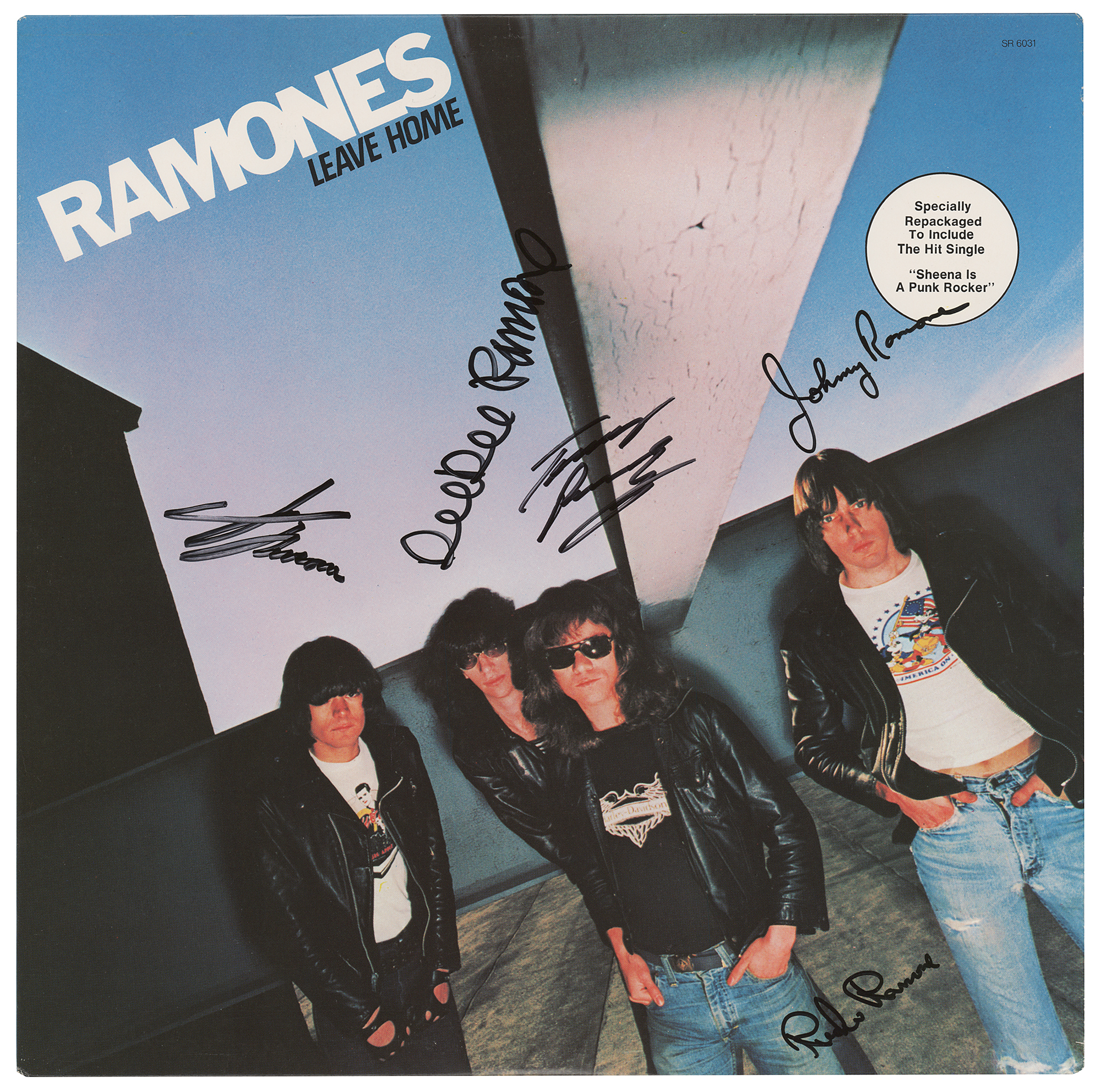 Leave Home album by the Ramones, signed on the front cover in black felt tip by the four musicians who performed on the album—Joey, Johnny, Tommy, and Dee Dee Ramone—as well as by Richie Ramone. In fine condition. The record is included.