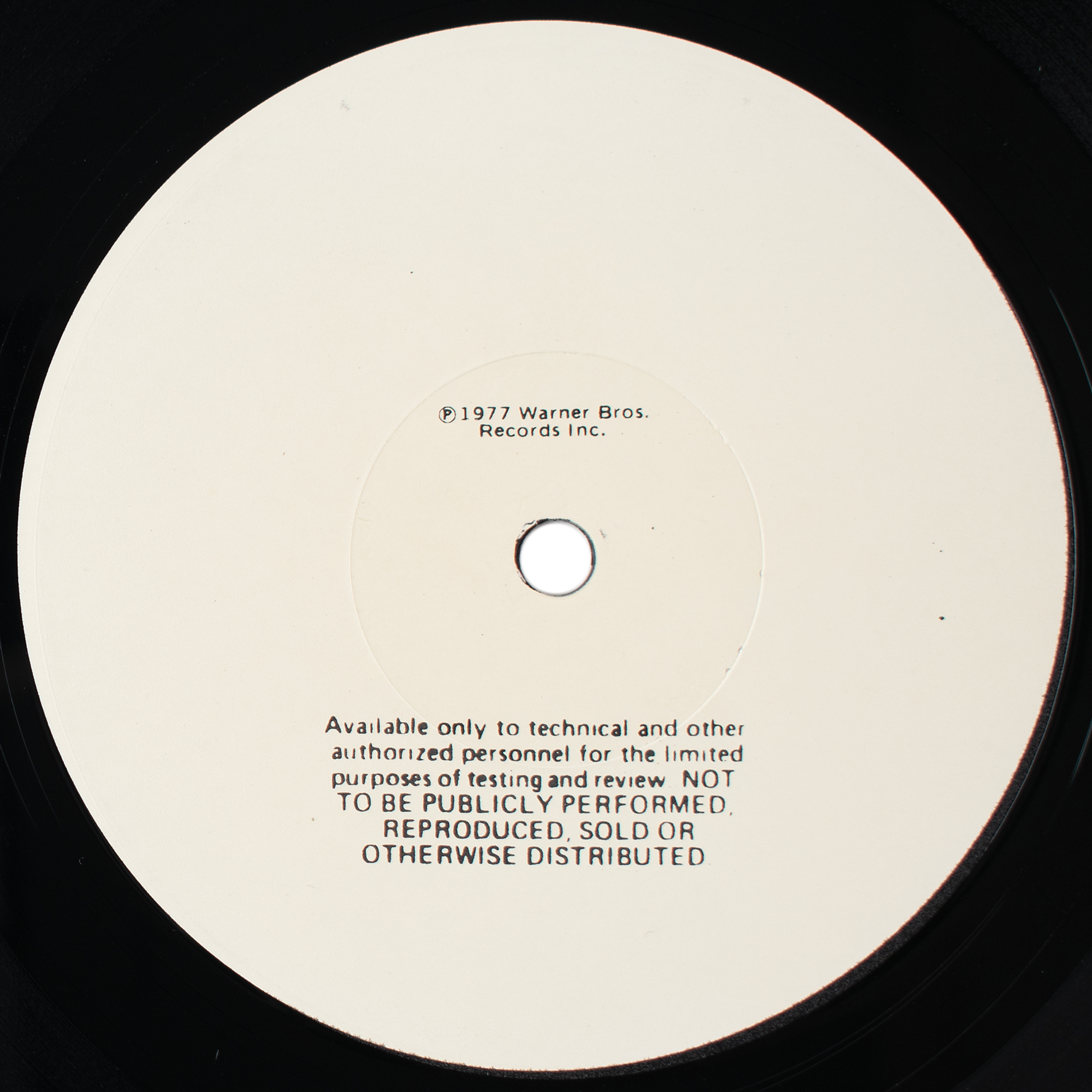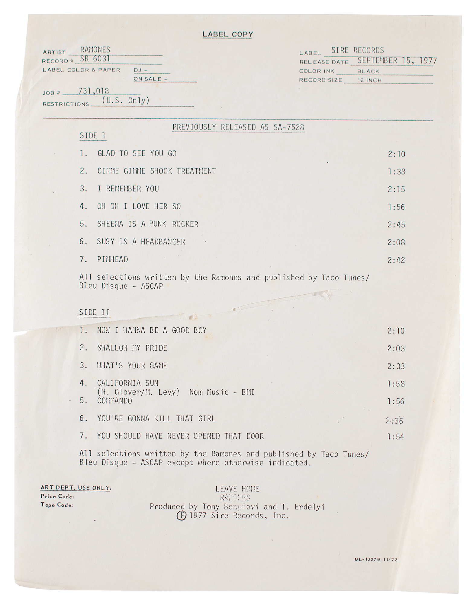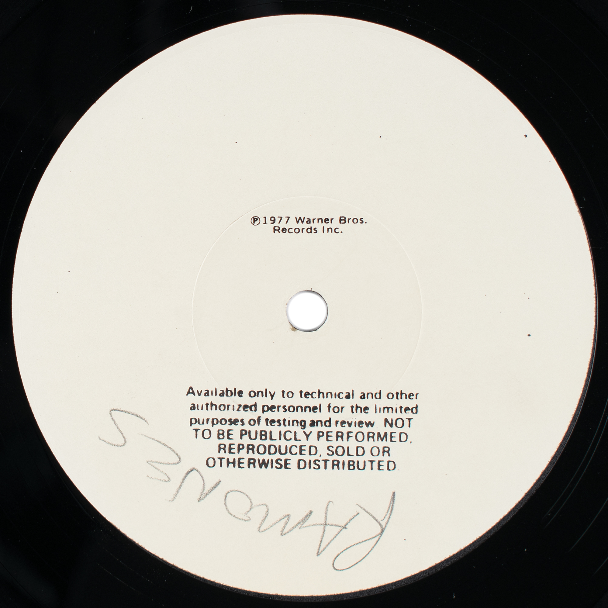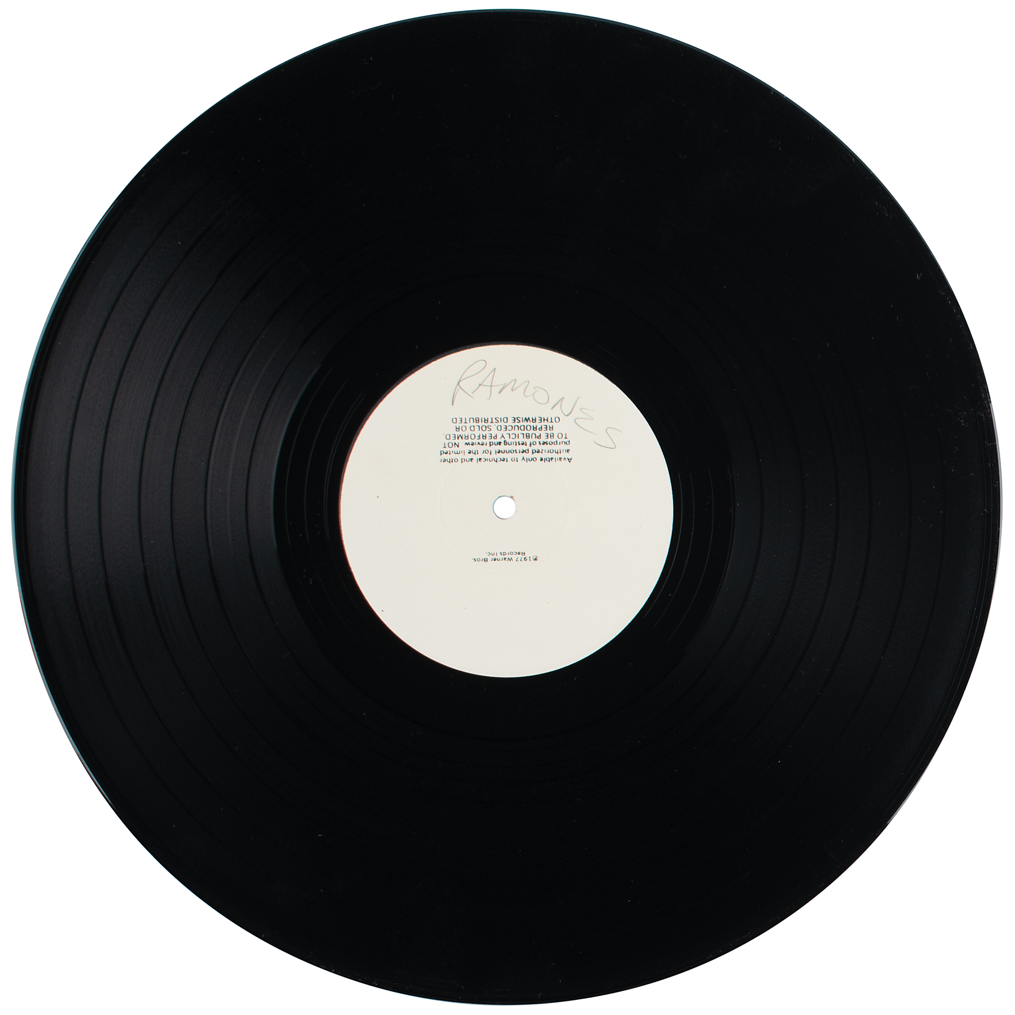 Uncommon test pressing of the Ramones album Leave Home, with both sides featuring a white "1977 Warner Bros. Records" label stating that the record is "Not to Be Publicly Performed, Reproduced, Sold or Otherwise Distributed." One label marked in pencil, "Ramones." Includes the white album sleeve marked as "Ramones, Leave Home" and "SR 6031." In fine condition. Included is a label copy of a track listing for record "SR 6031," with release date of September 15, 1977; the sheet bears a horizontal slice from the left side.
